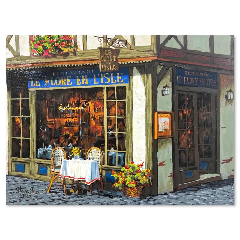 "Rendezvous" is a hand embellished limited edition printer's proof on stretched canvas by Viktor Shvaiko, numbered 3/3 and hand signed by the artist. Includes Letter of Authenticity. Measures approx. 12" x 16" (image). There is minor wear on the corners and edges that will be concealed when framed.