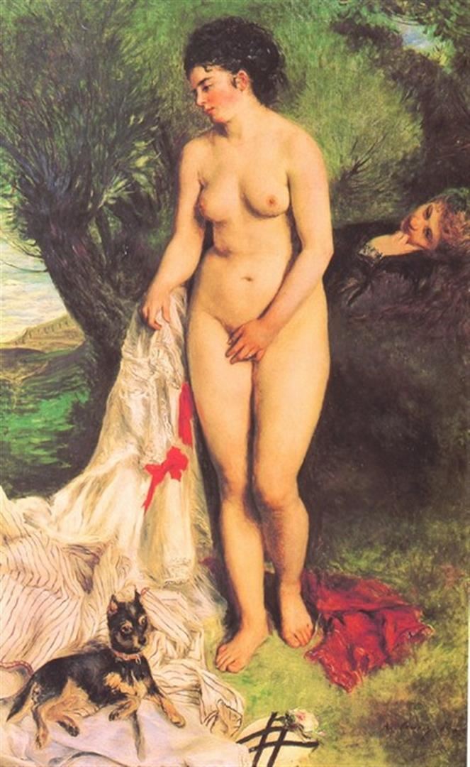 Artist: Pierre-Auguste Renoir 1841-1919 - Title: Bather with a Terrier - Medium: Fine Art Reproduction Giclee on Canvas - Image Size: Approximately 32 inches x 19.5 inches - Unframed on Unstretched Canvas - Biography: An innovative artist, Pierre-Augus