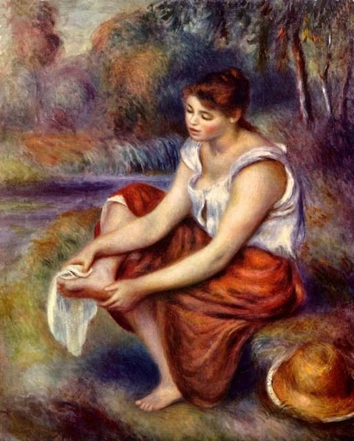 Artist: Pierre-Auguste Renoir 1841-1919 - Title: Girl Dryes Her Feet - Medium: Fine Art Reproduction Giclee on Canvas - Image Size: Approximately 20 inches x 16 inches - Unframed on Unstretched Canvas - Biography: An innovative artist, Pierre-Auguste Renoir was born on February 25, 1841, in Limoges, France. He started out as an apprentice to a porcelain painter and studied drawing in his free time. After years as a struggling painter, Renoir helped launch an artistic movement called Impressionism in 1870s. He eventually became one of the most highly regarded artists of his time. He died in Cagnes-sur-Mer, France, in 1919. -
