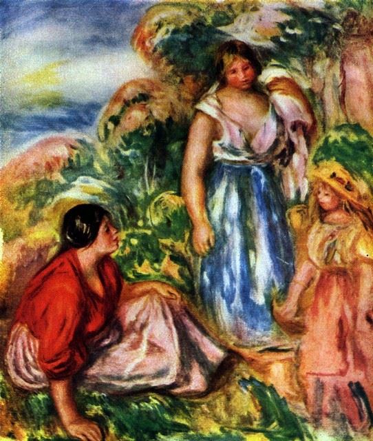 Artist: Pierre-Auguste Renoir 1841-1919 - Title: Two Women With Young Girls In A Landscape - Medium: Fine Art Reproduction Giclee on Canvas - Image Size: Approximately 20 inches x 17 inches - Unframed on Unstretched Canvas - Biography: An innovative