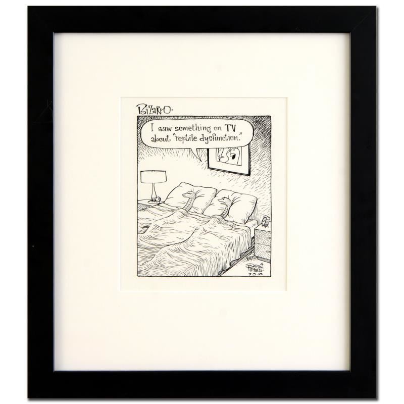 Enter a surreal and satirical world of twisted imagination and award winning creativity. "Reptile Dysfunction" is an original pen & ink drawing on paper by Dan Piraro, creator of the critically acclaimed and award winning comic strip, Bizarro! This piece is hand signed and comes framed. Includes Certificate of Authenticity! Measures approx. 13" x 14" (with frame), 6" x 7" (image). ** Please note: there is minor wear to the corners of the frame. **