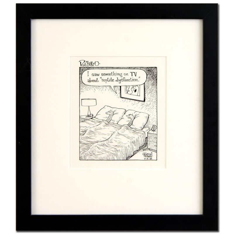 Enter a surreal and satirical world of twisted imagination and award winning creativity. "Reptile Dysfunction" is an original pen & ink drawing on paper by Dan Piraro, creator of the critically acclaimed and award winning comic strip, Bizarro! This piece is hand signed and comes framed. Includes Certificate of Authenticity! Measures approx. 13" x 14" (with frame), 6" x 7" (image). ** Please note: there is minor wear to the corners of the frame. **