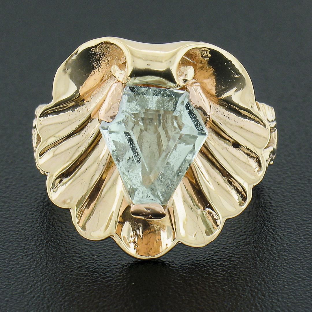 A vintage retro 14k rosy yellow gold ring, with 1 natural aquamrine ( 9.4x8.3mm). The ring is size 5.5, weighs a total of 5.35 grams, and measures 16.9mm wide.