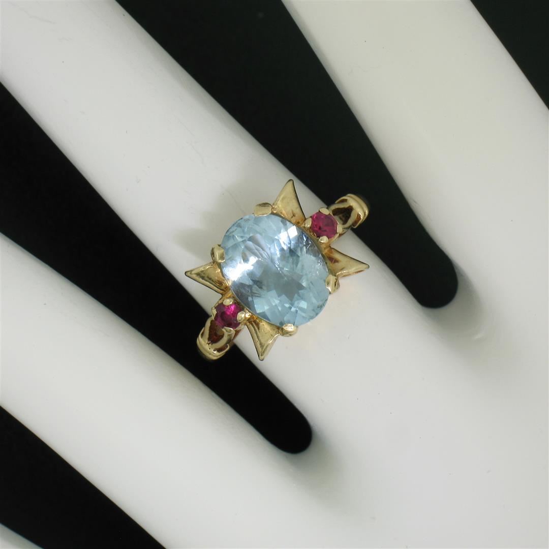 A vintage 14k yellow gold 2.18ct oval aquamarine and simulated ruby ring. The ring is size 6.0, weighs a total of 3.23 grams, and measures 10.10mm wide.