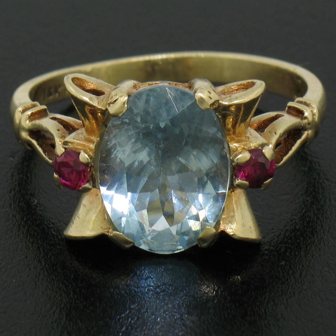 A vintage 14k yellow gold 2.18ct oval aquamarine and simulated ruby ring. The ring is size 6.0, weighs a total of 3.23 grams, and measures 10.10mm wide.