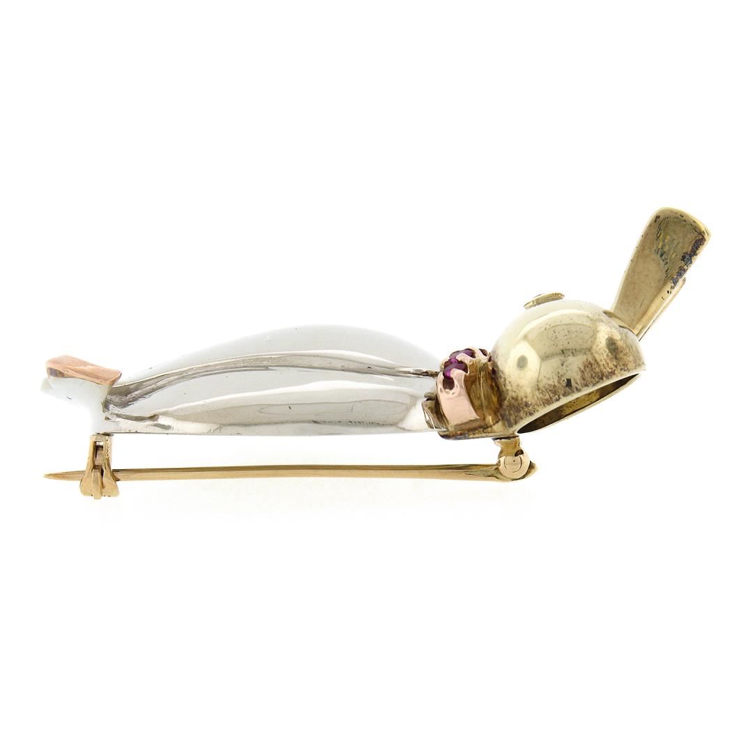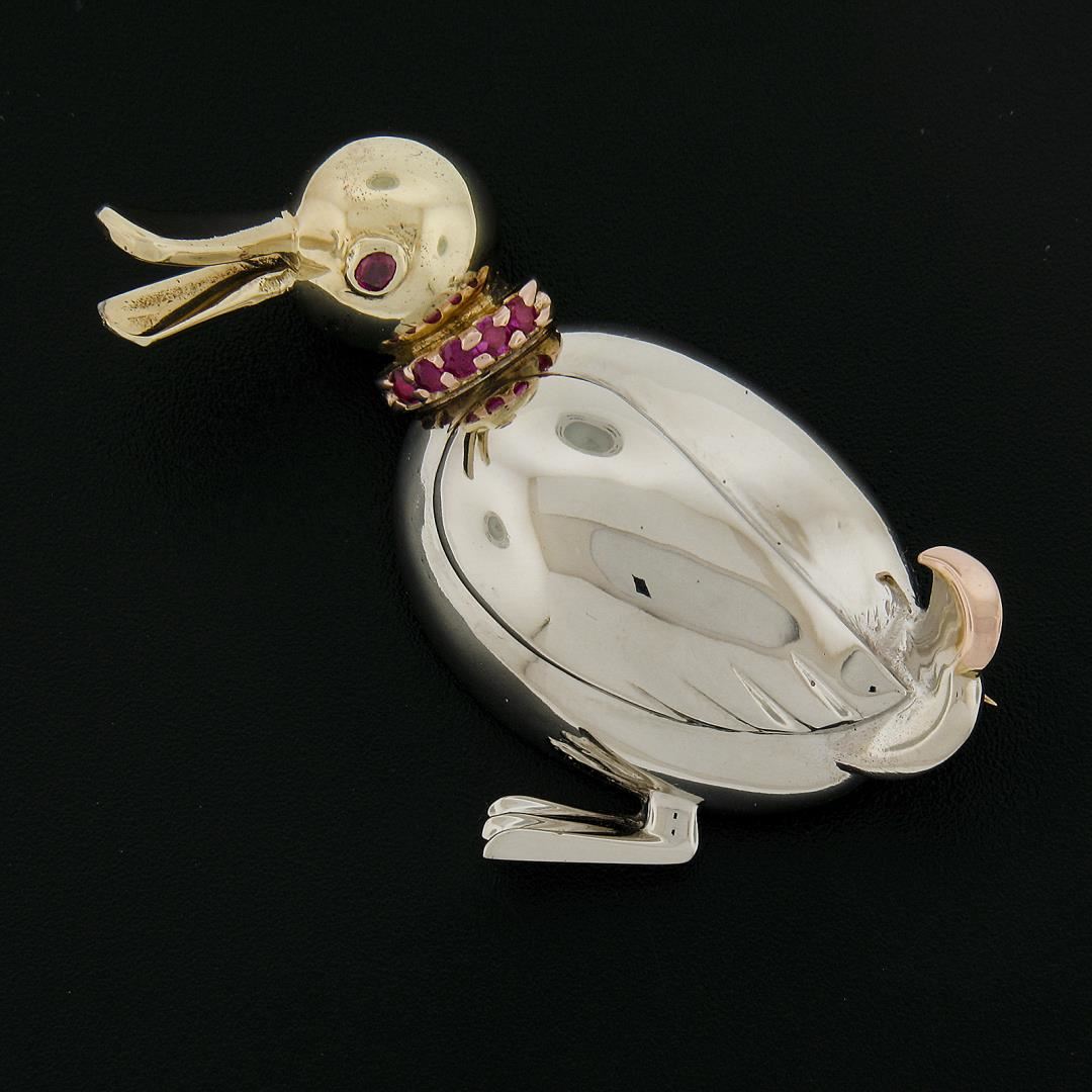 Retro Solid 14K Tri Gold 3D Duck Bird Pin Brooch w/ 0.20ctw Round Brilliant Ruby