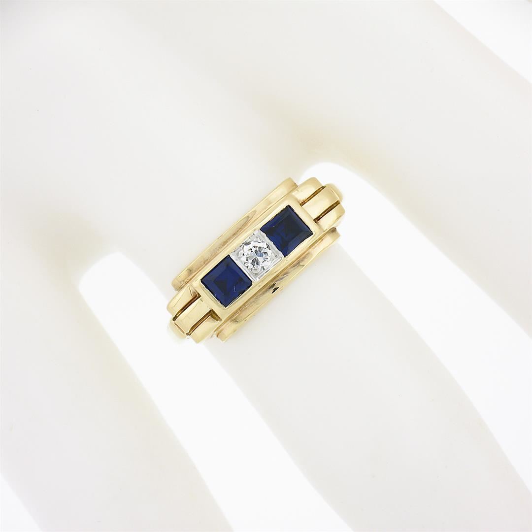 A vintage solid 14k yellow gold band ring, with 2 square cut blue stones (2.80x2.80mm each), and 1 old transitional cut natural diamond (H - VS1 ; 0.06ct). The ring is size 5.0, weighs a total of 2.88 grams, and measures 6.50mm wide.