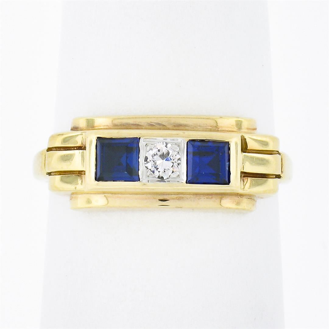 A vintage solid 14k yellow gold band ring, with 2 square cut blue stones (2.80x2.80mm each), and 1 old transitional cut natural diamond (H - VS1 ; 0.06ct). The ring is size 5.0, weighs a total of 2.88 grams, and measures 6.50mm wide.