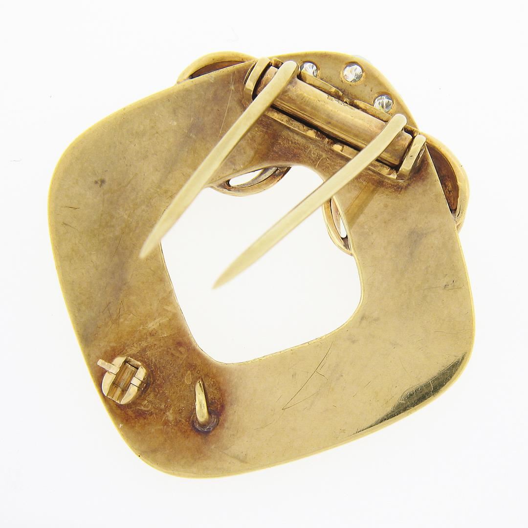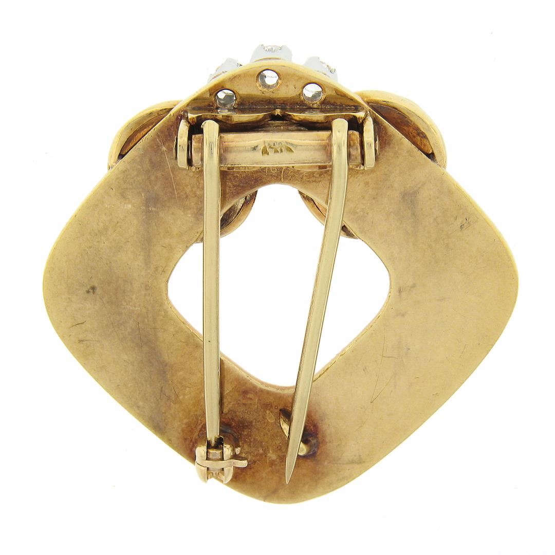 A vintage solid 14k yellow gold pin brooch, with 3 round cut natural diamonds (F-G - VS2-SI1 ; 0.12ctw). Measures 32.6x32.3mm and weighs a total of 11.14 grams.
