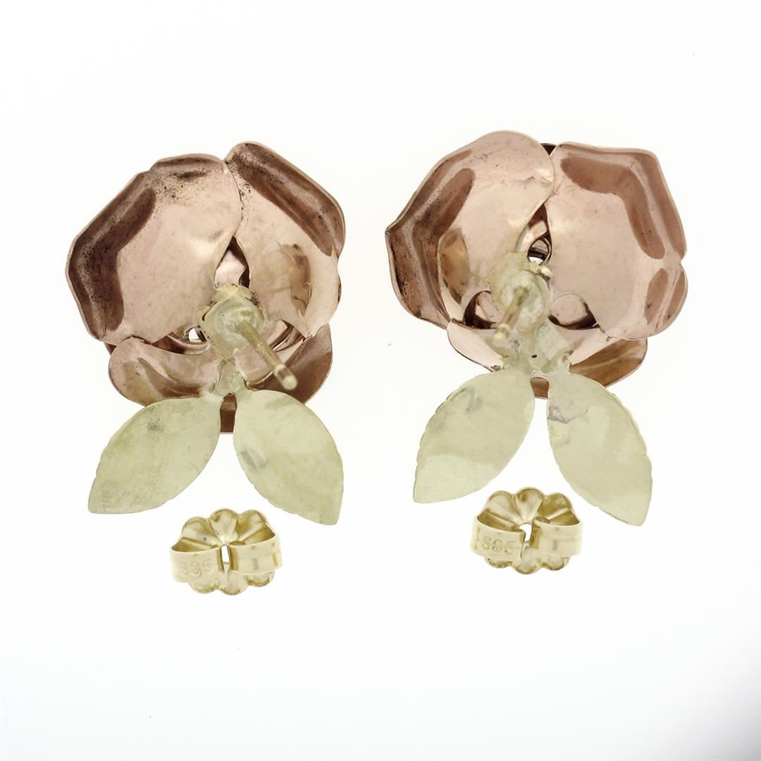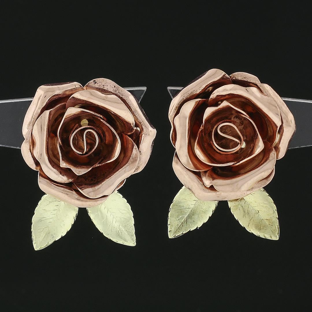 A vintage retro solid 14k rose & green gold rose flower pair of earrings. The earrings measure approximately 16.9x21.5mm and weigh a total of 7.40 grams.