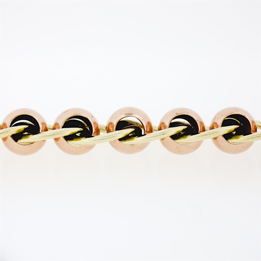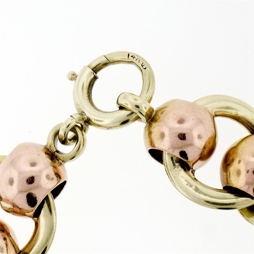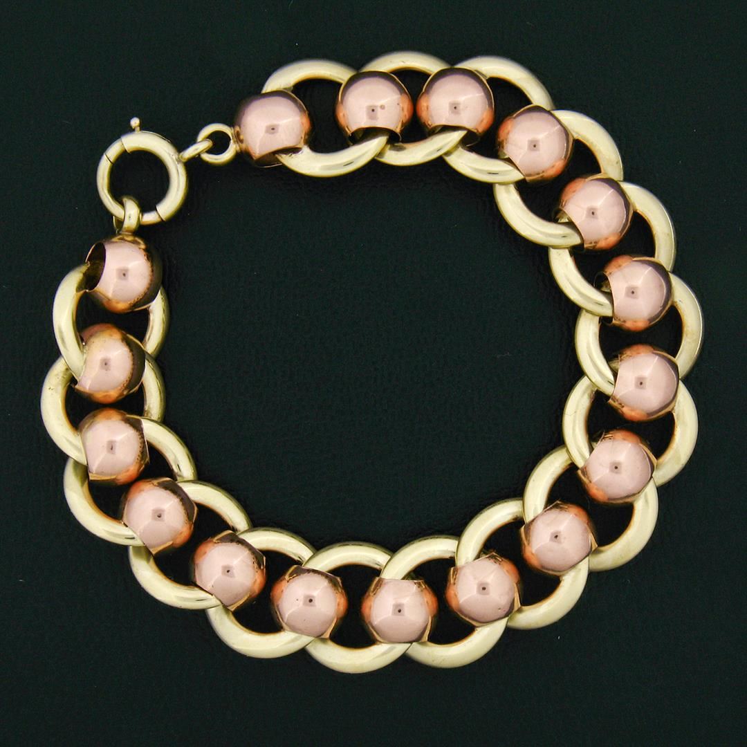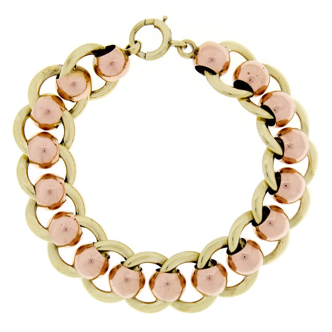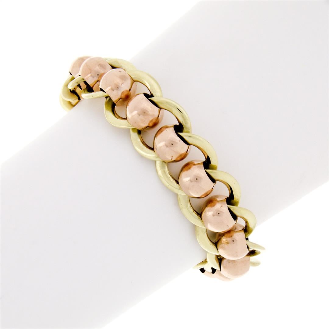 A retro solid 14k rose and green gold link bracelet. It weighs a total of 44.49 grams, measures 14.63mm wide, and measures 6 inches in length.