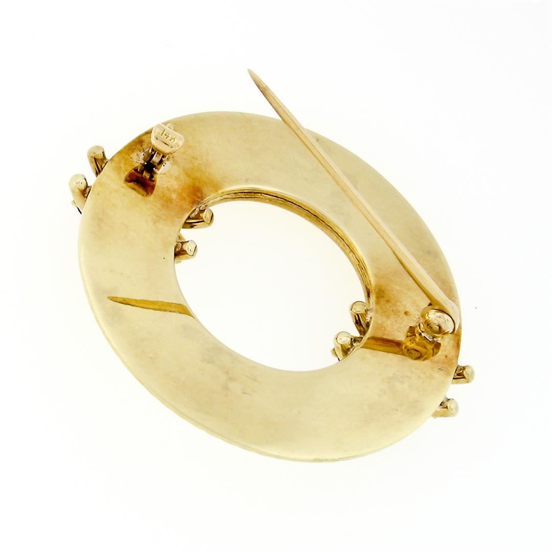A vintage 14k yellow gold wreath brooch, with 8 round brilliant cut natural rubies (0.64ctw). Measures 38.82x42.67mm and weighs a total of 13.16 grams.