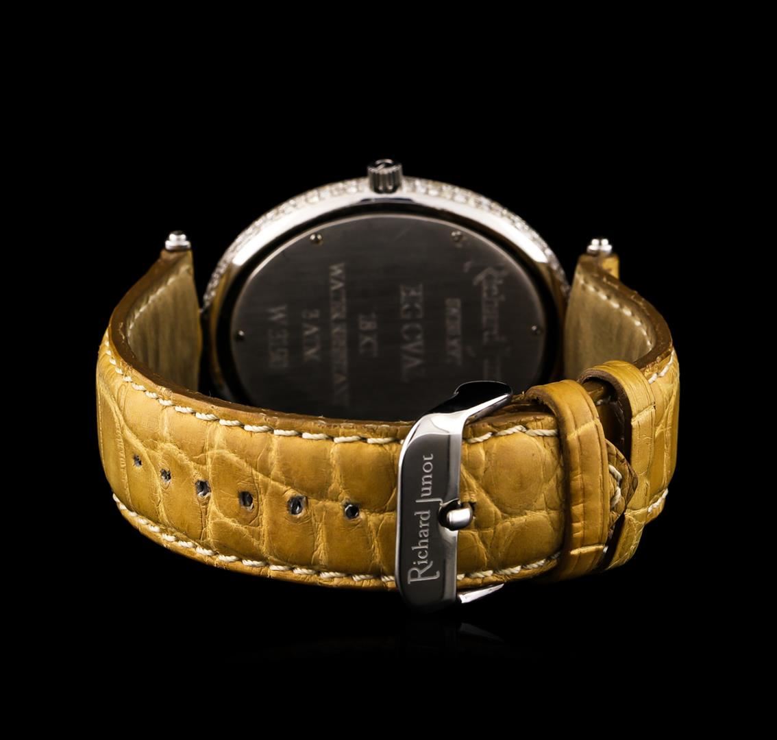 One, Richard Junot Big Oval wristwatch electronically tested 18KT White Gold, Oval Case: 43 x 36mm, Case Shoulders: set with diamonds, Case Back: engraved with the manufacturers name, model name, and information, Case lugs: set with diamonds, Crown: scalloped, Bezel: diamond set, Crystal: synthetic sapphire. Movement: quartz, Signed Dial: mother of pearl with diamond set ribbons for numerals, and Blued Steel hands, Bracelet: saddle stitched leather strap. Condition: G-5 Fine. Eight inch length, adjustable. Containing: Eighteen prong set round brilliant cut diamonds, measuring 5.20 - 5.00 x 3.06mm (depth est.) approximate total weight of 18 Stones = 8.74ct. The group is composed of a mix of naturally colored faint brown, very light brown and light brown diamonds. Graded in the setting. Clarity: SI-1 to SI-2 One Hundred Seventy-Four prong set round brilliant cut diamonds, measuring 1.30 - 1.20 x 0.75mm (depth est.) approximate total weight of 174 Stones = 1.24ct. Graded in the setting. Clarity: SI-1 to I-2. Color: G - I One Hundred Four prong set round brilliant cut diamonds, measuring 1.10 - 1.00 x 0.63mm (depth est.) approximate total weight of 104 Stones = 0.44ct. Graded in the setting. Clarity: SI-2 to I-2. Color: G - I. Total Weight of Diamonds 10.42ct. Weight of Watch 82.66gm. AIG Appraised at $36,000.00.