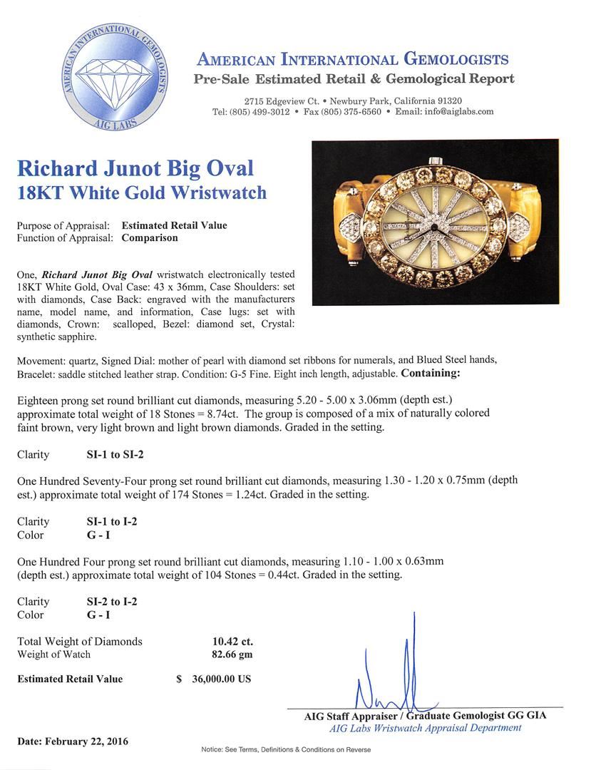 One, Richard Junot Big Oval wristwatch electronically tested 18KT White Gold, Oval Case: 43 x 36mm, Case Shoulders: set with diamonds, Case Back: engraved with the manufacturers name, model name, and information, Case lugs: set with diamonds, Crown: scalloped, Bezel: diamond set, Crystal: synthetic sapphire. Movement: quartz, Signed Dial: mother of pearl with diamond set ribbons for numerals, and Blued Steel hands, Bracelet: saddle stitched leather strap. Condition: G-5 Fine. Eight inch length, adjustable. Containing: Eighteen prong set round brilliant cut diamonds, measuring 5.20 - 5.00 x 3.06mm (depth est.) approximate total weight of 18 Stones = 8.74ct. The group is composed of a mix of naturally colored faint brown, very light brown and light brown diamonds. Graded in the setting. Clarity: SI-1 to SI-2 One Hundred Seventy-Four prong set round brilliant cut diamonds, measuring 1.30 - 1.20 x 0.75mm (depth est.) approximate total weight of 174 Stones = 1.24ct. Graded in the setting. Clarity: SI-1 to I-2. Color: G - I One Hundred Four prong set round brilliant cut diamonds, measuring 1.10 - 1.00 x 0.63mm (depth est.) approximate total weight of 104 Stones = 0.44ct. Graded in the setting. Clarity: SI-2 to I-2. Color: G - I. Total Weight of Diamonds 10.42ct. Weight of Watch 82.66gm. AIG Appraised at $36,000.00.