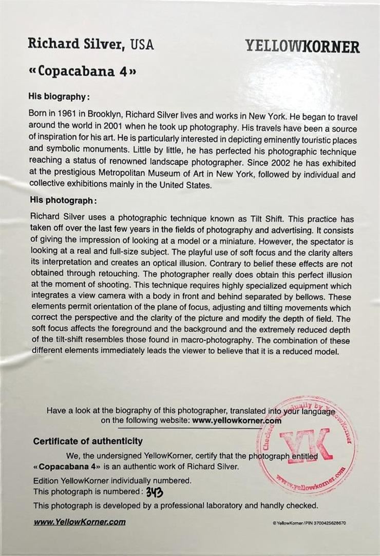 Richard Silver Copacabana Beach Rio de Janeiro, Brazil YellowKorner Certified Photograph. Certificate of Authenticity from YellowKorner affixed to the back. Matted Dimensions 16"x20". Protected with Clear Mylar Sleeve.