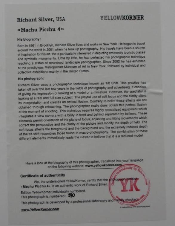 Machu Picchu 4 Certified Photograph, Richard Silver YellowKorner Certified Photograph. Certificate of Authenticity from YellowKorner affixed to the back. Matted Dimensions 16"x20". Protected with Clear Mylar Sleeve.
