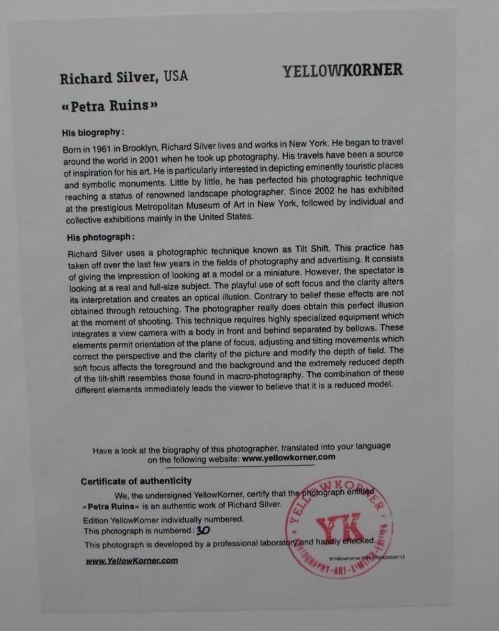 Petra Ruins Certified Photograph, Richard Silver YellowKorner Certified Photograph. Certificate of Authenticity from YellowKorner affixed to the back. Matted Dimensions 16"x20". Protected with Clear Mylar Sleeve.