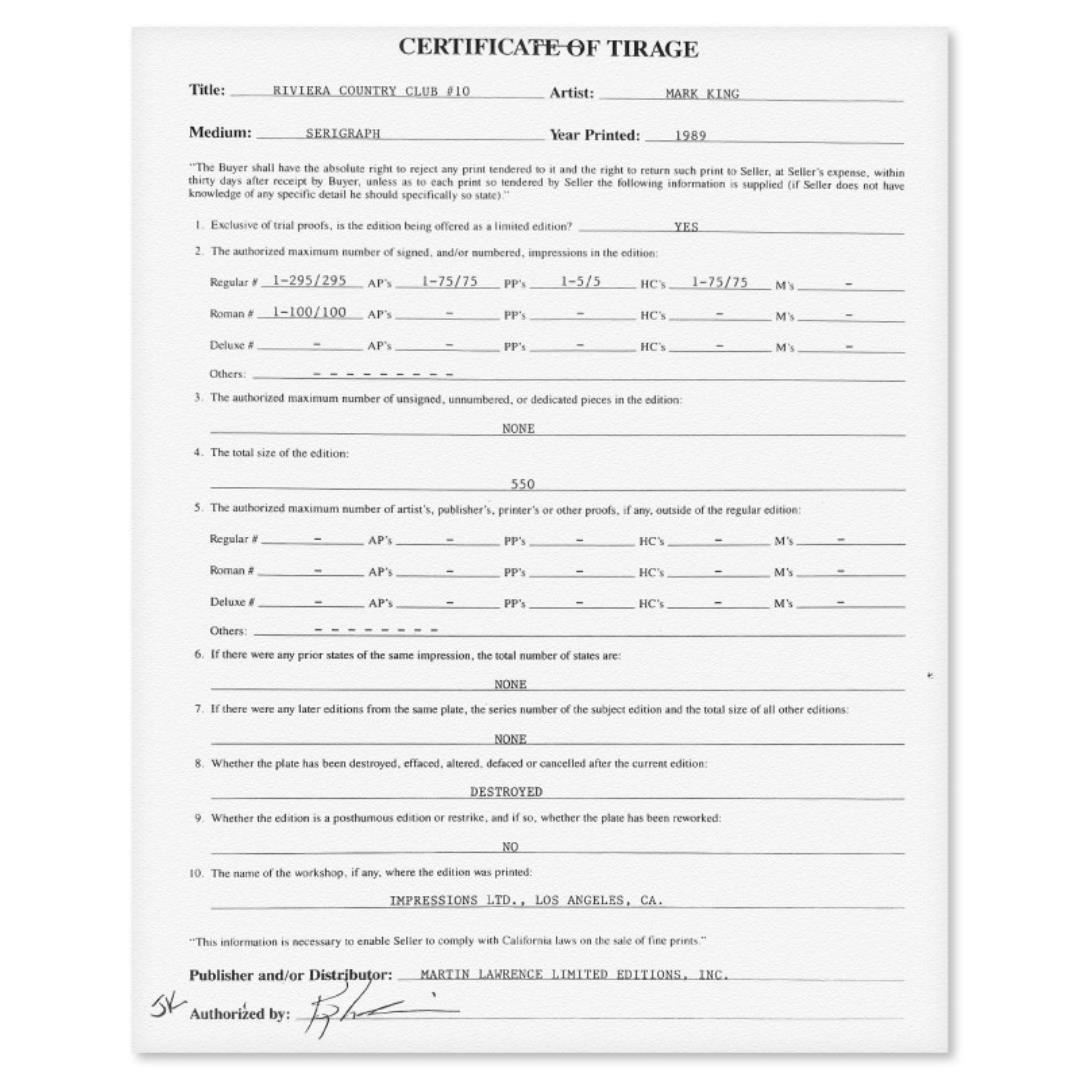 "Riviera Country Club #10" is a limited edition serigraph on paper by Mark King (1931-2014). Hand signed and numbered, this piece comes with a letter of authenticity and measures approximately 20" x 23" (image).
