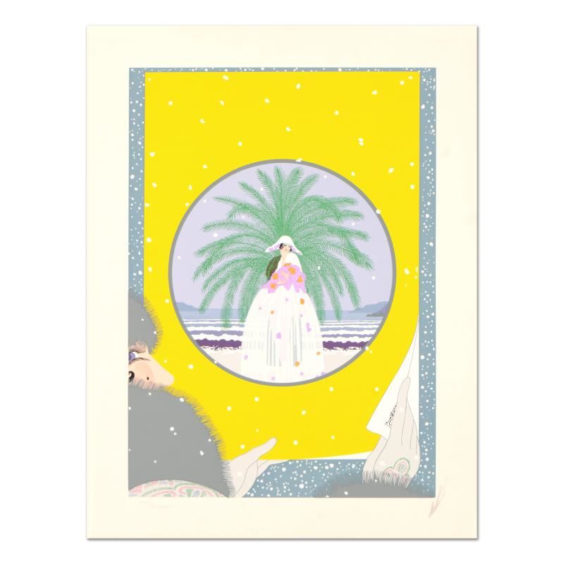 "Riviera" is a limited edition serigraph on paper by Erte (1892-1990), numbered and hand signed by the artist. Includes Certificate of Authenticity. Measures approx. 18.5" x 24.5" (border), 14.5" x 21.5" (image). There are slight creases on the corners and edges that may be concealed when framed. Please allow 5 additional business for items that include canvas stretch or framing.