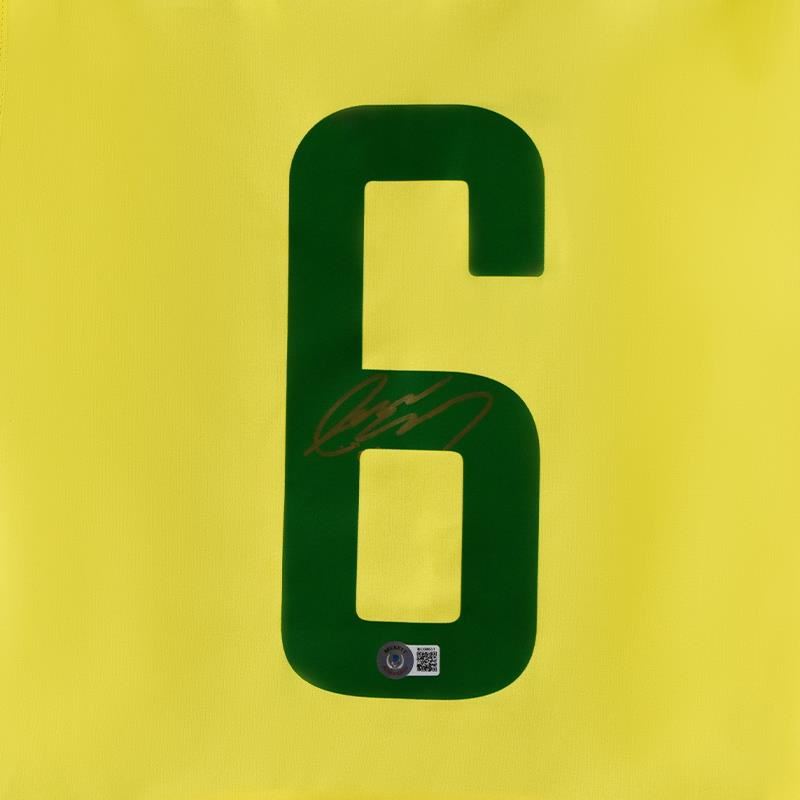 This is a replica Brazil soccer jersey autographed by Roberto Carlos. This piece is presented with a Certificate of Authenticity from Beckett with a QR code and certification number. Measures approx. 30" x 28" (jersey).
