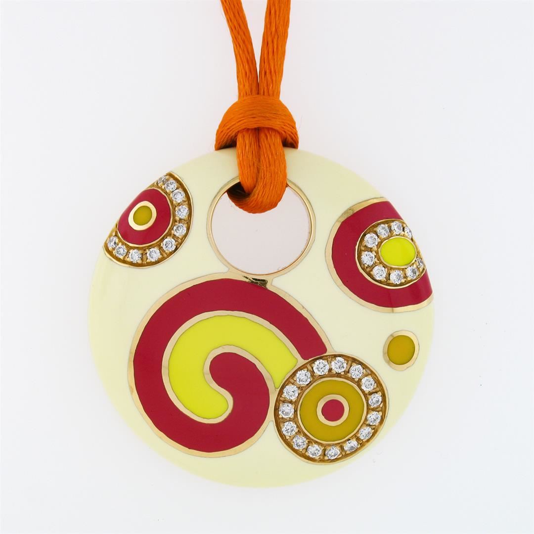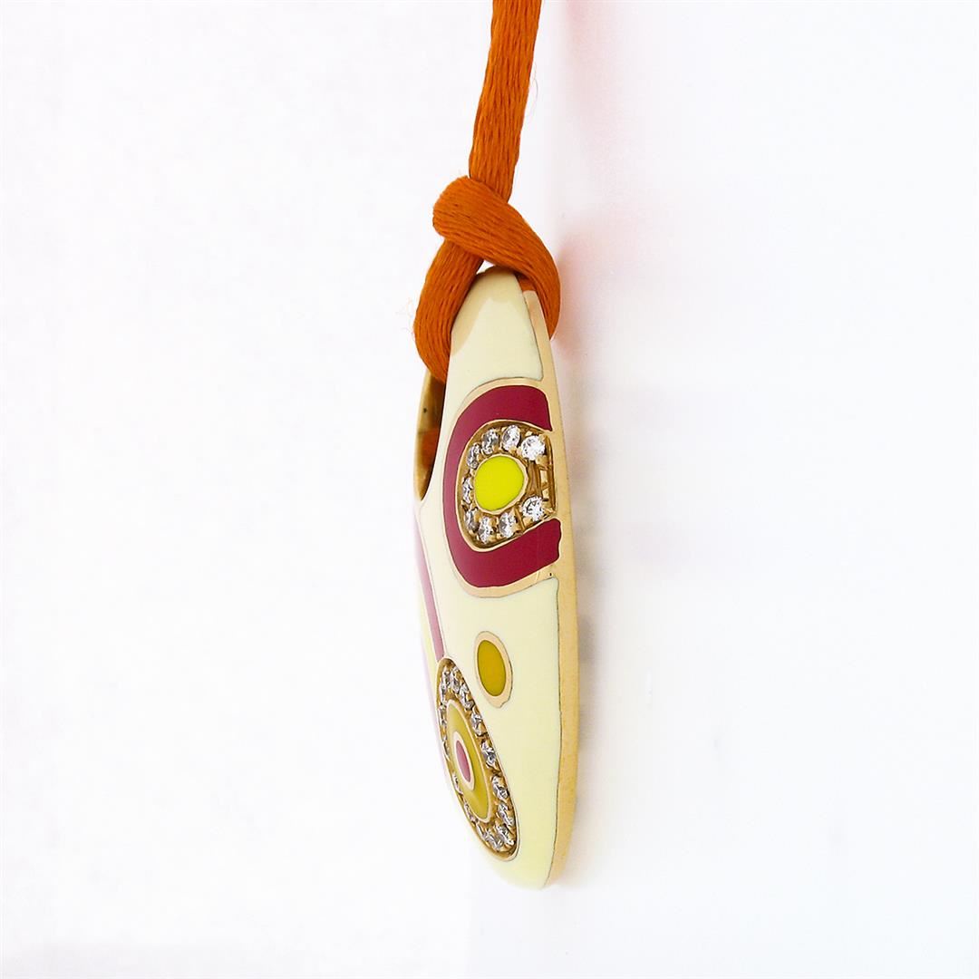 A solid 18k yellow gold pendant necklace by Roberto Coin, with enamel work & 34 round brilliant cut natural diamonds (E/F - VVS2/VS1 ; 0.52ctw). 15 inch orange silk cord link chain, 23.23 grams total weight, pendant measures 36.5mm.
