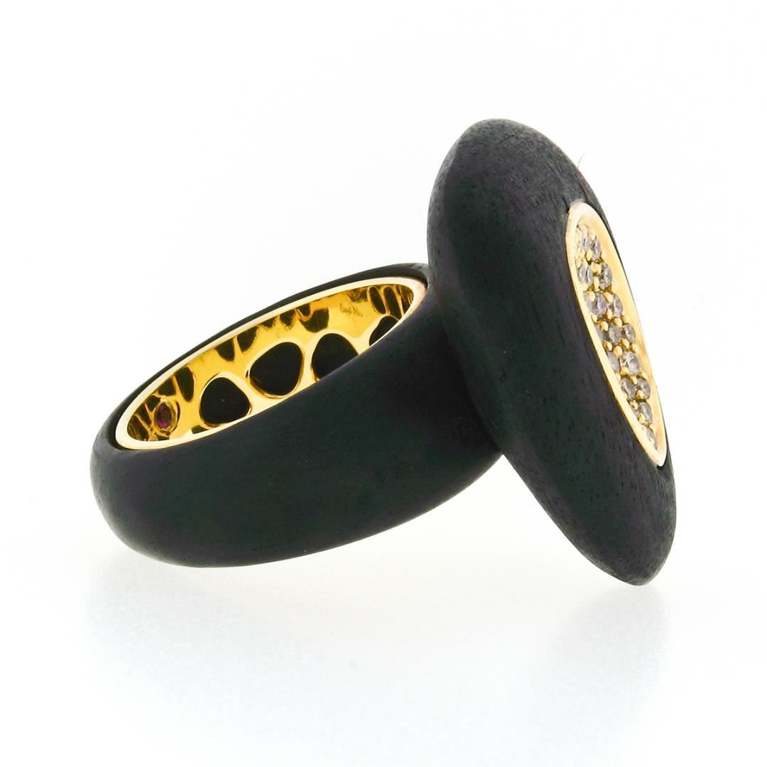 A solid 18k yellow gold plating over silver ring by Roberto coin, featuring black ebony wood and 43 round brilliant cut natural diamonds (Fancy Brown Color - VS1/VS2 ; 0.85ctw). The ring is size 7.0, weighs a total of 9.95 grams, and measures 27.90mm wide.