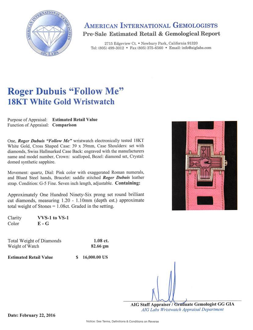 One, Roger Dubuis "Follow Me" wristwatch electronically tested 18KT White Gold, Cross Shaped Case: 39 x 39mm, Case Shoulders: set with diamonds, Swiss Hallmarked Case Back: engraved with the manufacturers name and model number, Crown: scalloped, Bezel: diamond set, Crystal: domed synthetic sapphire. Movement: quartz, Dial: Pink color with exaggerated Roman numerals, and Blued Steel hands, Bracelet: saddle stitched Roger Dubuis leather strap. Condition: G-5 Fine. Seven inch length, adjustable. Containing: Approximately One Hundred Ninety-Six prong set round brilliant cut diamonds, measuring 1.20 - 1.10mm (depth est.) approximate total weight of Stones = 1.08ct. Graded in the setting. Clarity: VVS-1 to VS-1. Color: E - G. Total Weight of Diamonds 1.08ct. Weight of Watch 82.66gm. AIG Appraised at $16,000.00.