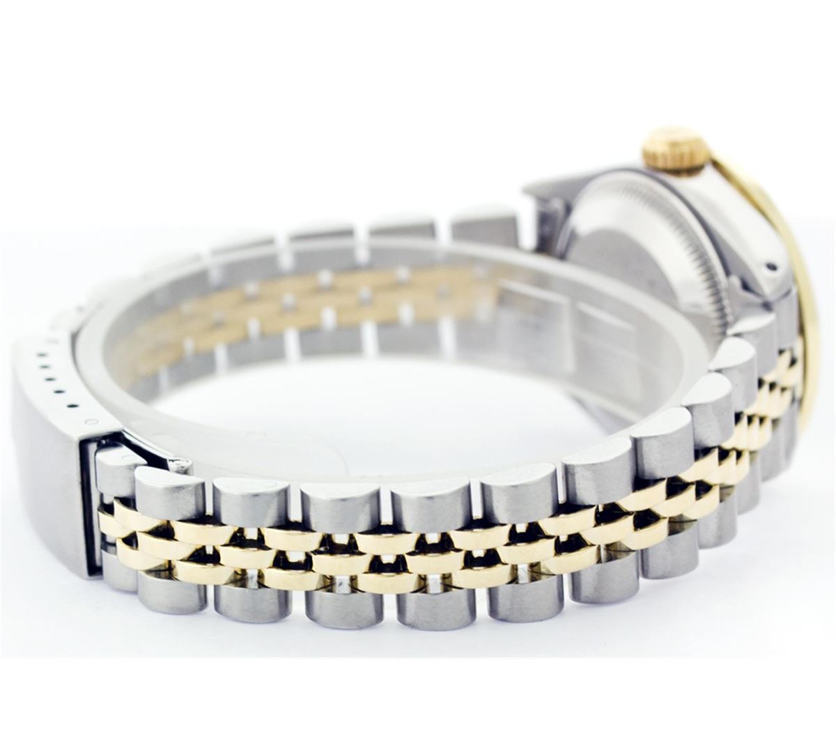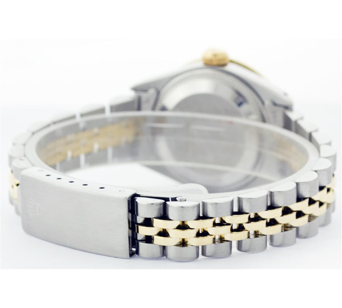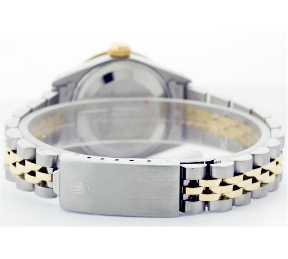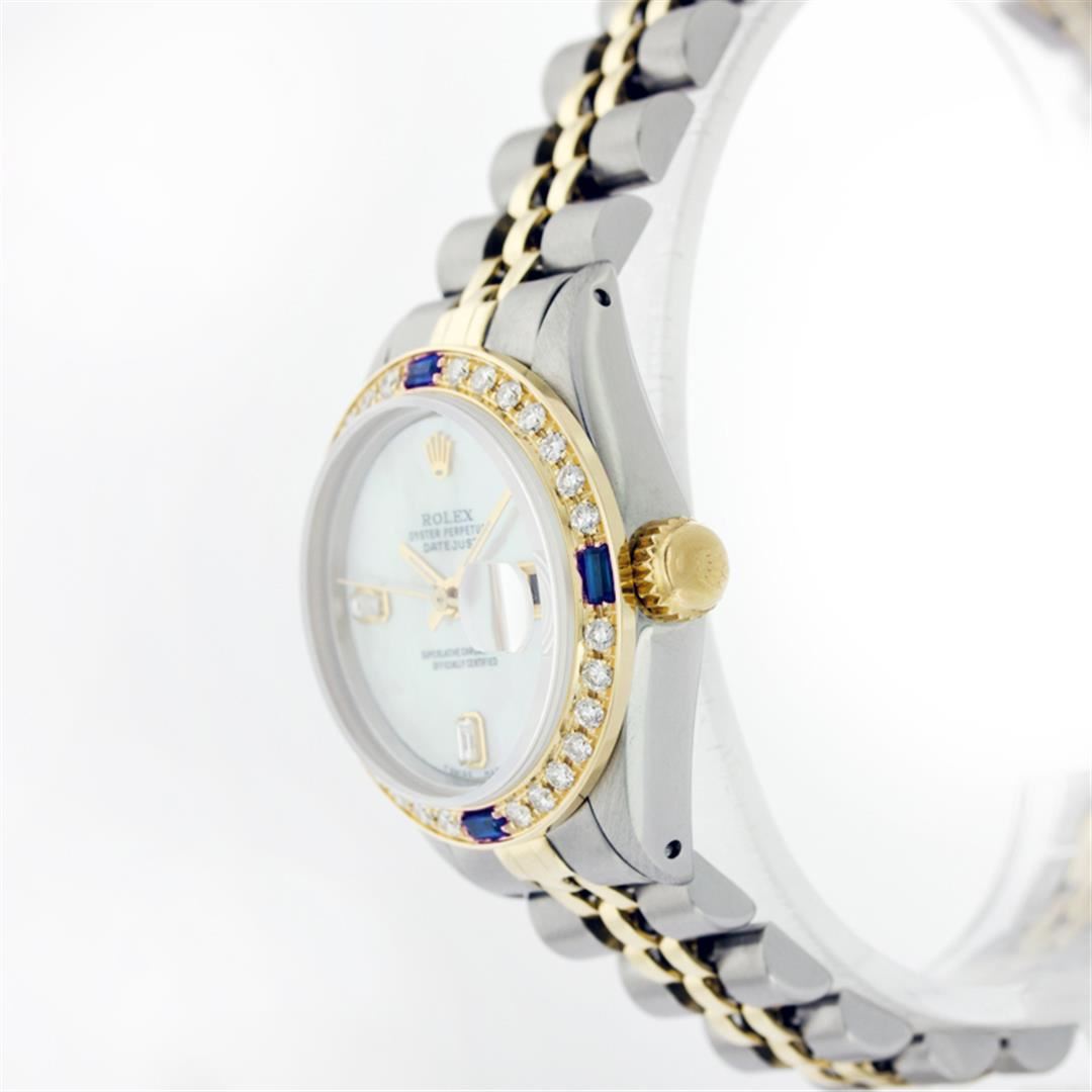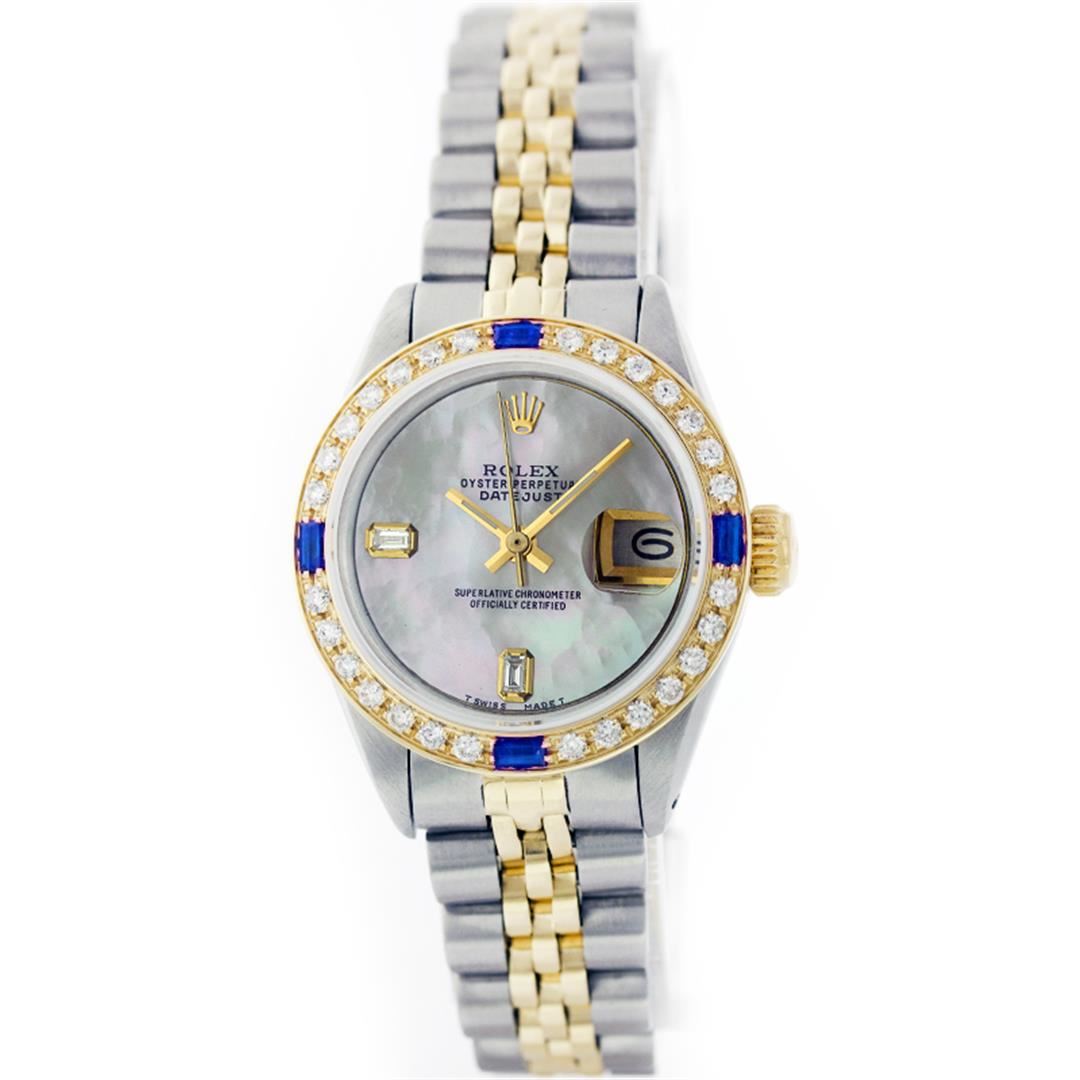 One Ladies Two Tone Rolex Datejust Polished, Serviced & Electronically Tested, 14K Yellow Gold & Stainless Steel Case:26mm, 14K Yellow Gold Crown, Custom Bezel: 18K Yellow Gold Sapphire Beadset Diamond Bezel, Stone Count: 28 Diamonds + 4 Sapphires, Total Weight .70 Carat, Clarity: Si-VS, Color: G to H. Custom Crystal: Synthetic Sapphire Cyclops Lens. Movement: Automatic Winding Movement Caliber 2030. Custom Dial: Mother Of Pearl With Baguette Diamonds, Stone Count: 2 Baguette Diamonds in Dial. Date Window: 3 O'Clock Position Date Display, Non Quickset, Model: Datejust, Condition: G-6 Extra Fine. Bracelet: Two Tone 14K Yellow Gold & Stainless Steel Jubilee. Bright Polish. 5.5 Inch Length, Adjustable. Standard Clasp, With Rolex Logo.