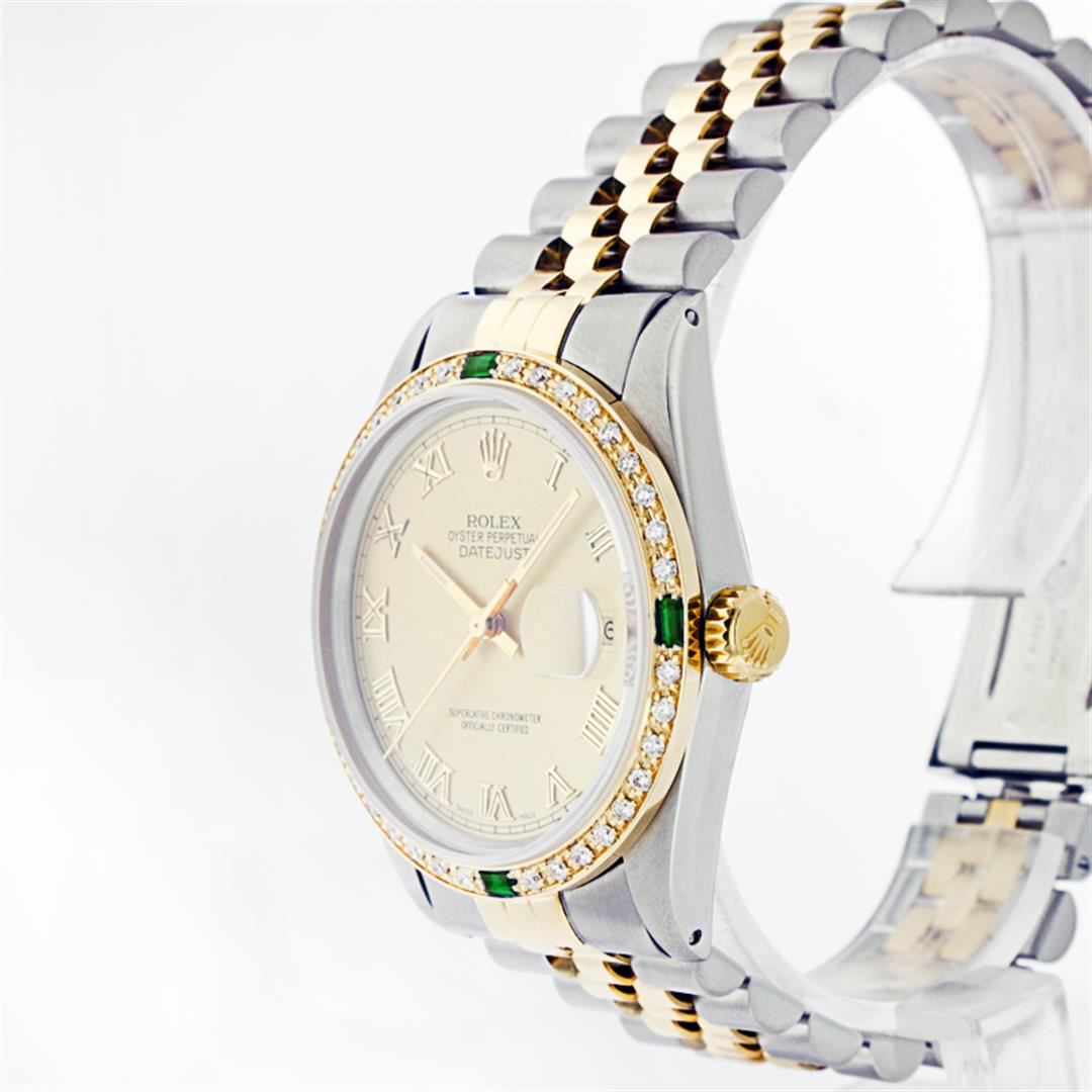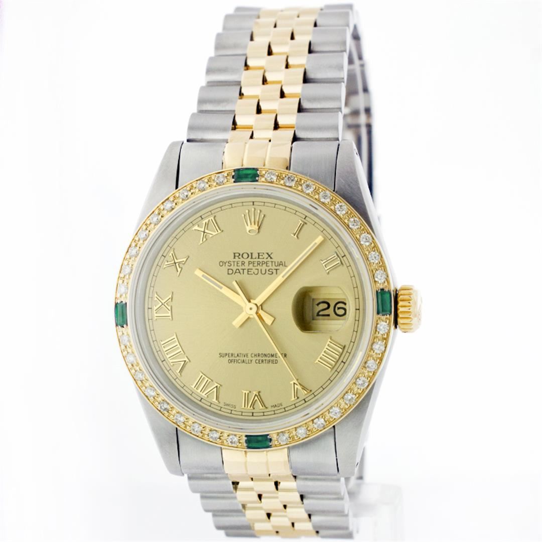 One Gents Two Tone Rolex Datejust Polished, Fully Serviced & Electronically Tested, 14K Yellow Gold & Stainless Steel Case:36mm, 14K Yellow Gold Crown, Custom Bezel: 18K Yellow Gold Emerald Beadset Diamond Bezel, Diamond Count: 36 Diamonds + 4 Emeralds, Total Weight 1.0 Carat, Clarity: Si-VS, Color: G to H. Custom Crystal: Synthetic Sapphire Cyclops Lens. Movement: Automatic Winding Movement Caliber 3035. Custom Dial: Champagne Roman Dial With Square Track. Date Window: 3 O'Clock Position Date Display, Quickset, Model: Datejust Condition: G-6 Extra Fine. Bracelet: Two Tone 14K Yellow Gold & Stainless Steel Jubilee. Bright Polish. 6.5 Inch Length, Adjustable. Standard Clasp, With Rolex Logo.