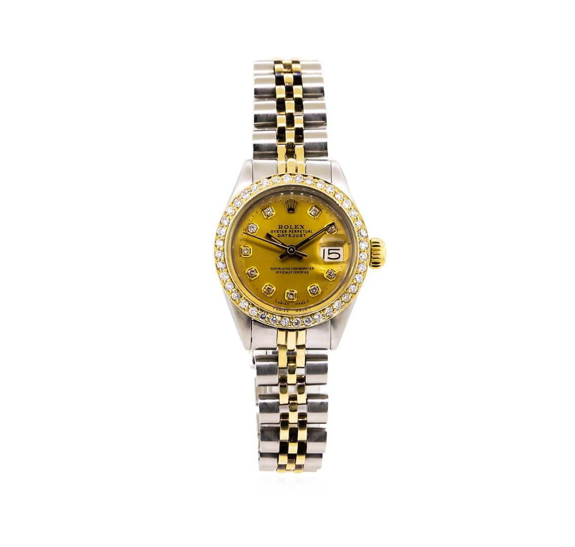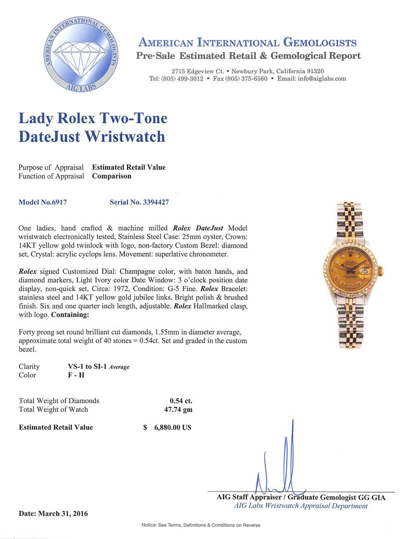 One ladies, hand crafted & machine milled Rolex DateJust Model wristwatch electronically tested, Stainless Steel Case: 25mm oyster, Crown: 14KT yellow gold twinlock with logo, non-factory Custom Bezel: diamond set, Crystal: acrylic cyclops lens. Movement: superlative chronometer. Rolex signed Customized Dial: Champagne color, with baton hands, and diamond markers, Light Ivory color Date Window: 3 o'clock position date display, non-quick set, Circa: 1972, Condition: G-5 Fine. Rolex Bracelet: stainless steel and 14KT yellow gold jubilee links. Bright polish & brushed finish. Six and one quarter inch length, adjustable. Rolex Hallmarked clasp, with logo. Containing: Forty prong set round brilliant cut diamonds, 1.55mm in diameter average, approximate total weight of 40 stones = 0.54ct. Set and graded in the custom bezel. Clarity: VS-1 to SI-1 Average. Color: F - H. Total Weight of Diamonds 0.54ct. Total Weight of Watch 47.74gm. AIG Appraised at $6,880.00.