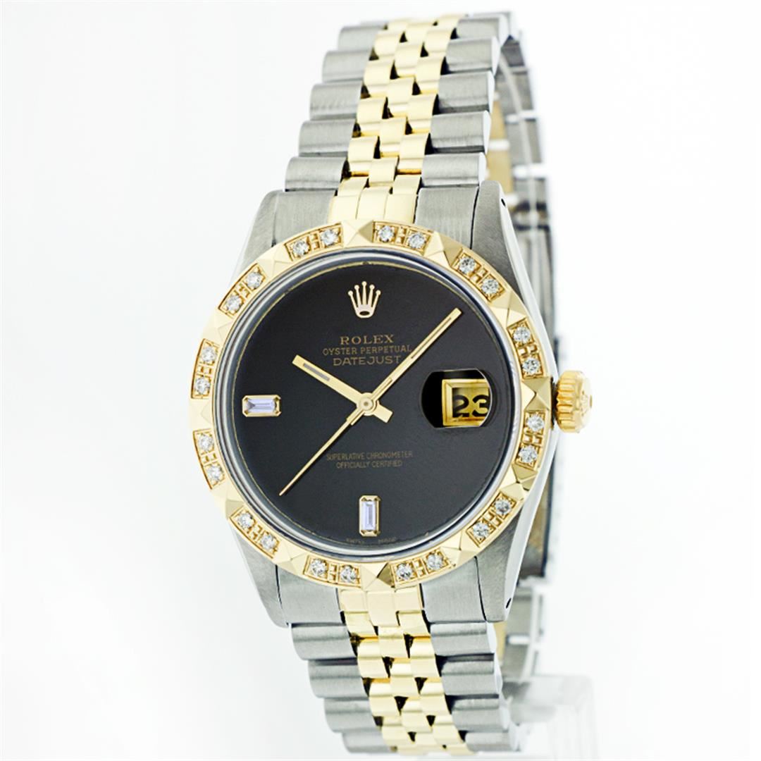 One Gents Two Tone Rolex Datejust Polished, Fully Serviced & Electronically Tested, 14K Yellow Gold & Stainless Steel Case:36mm, 14K Yellow Gold Crown, Custom Bezel: 18K Yellow Gold Pyramid Diamond Bezel, Diamond Count: 24 Diamonds, Total Weight .75 Carat, Clarity: Si-VS, Color: G to H. Custom Crystal: Synthetic Sapphire Cyclops Lens. Movement: Automatic Winding Movement Caliber 3035. Custom Dial: Black Onyx Baguette Diamond Dial, Diamond Count: 2 Baguette Diamonds In Dial, Color: G to H, Clarity: SI -VS. Date Window: 3 O'Clock Position Date Display, Quickset, Model: Datejust Condition: G-6 Extra Fine. Bracelet: Two Tone 14K Yellow Gold & Stainless Steel Jubilee. Bright Polish. 6.5 Inch Length, Adjustable. Standard Clasp, With Rolex Logo. Comes with a six month warranty card.