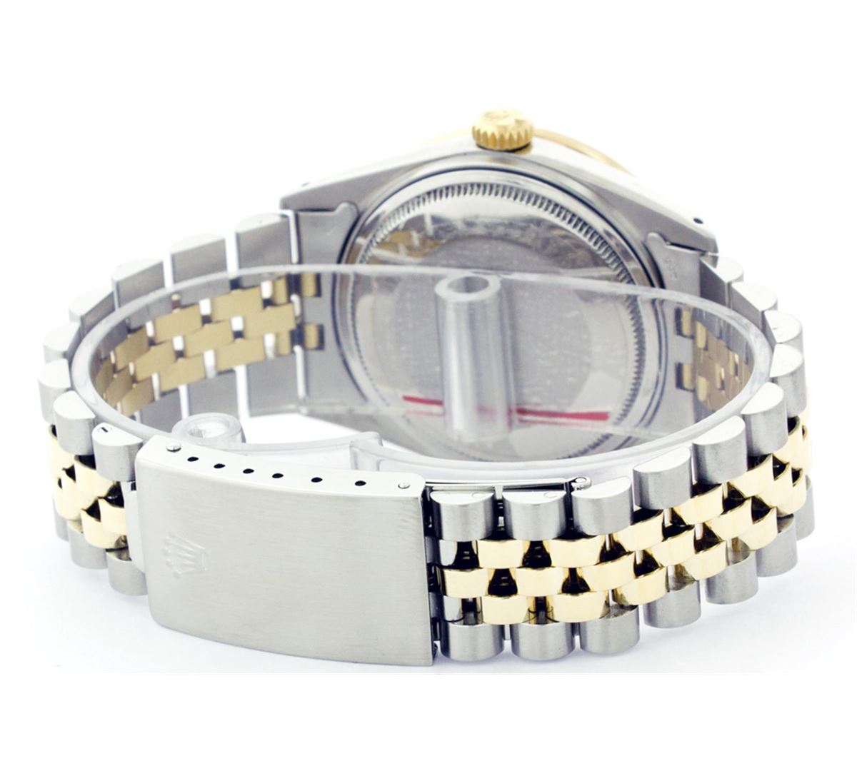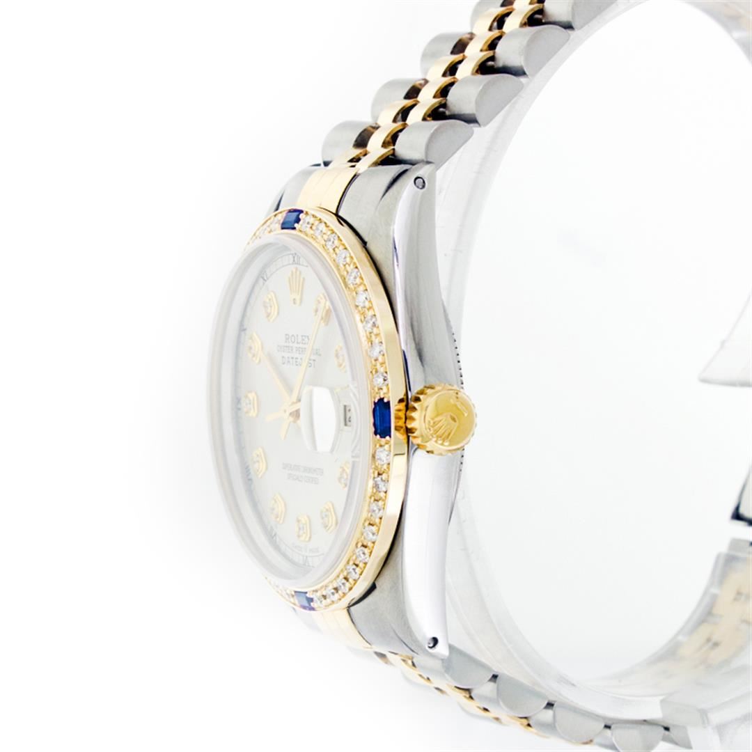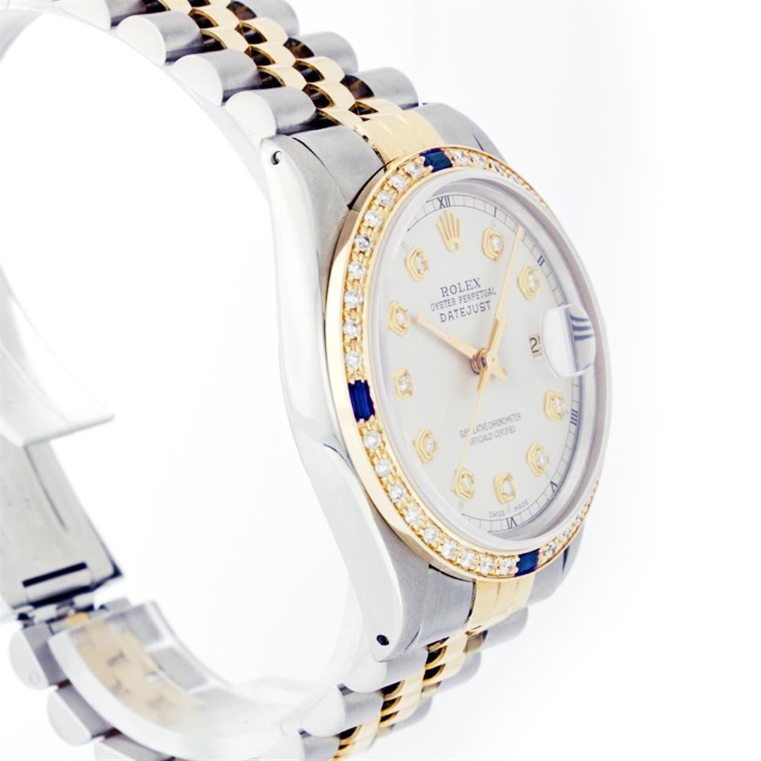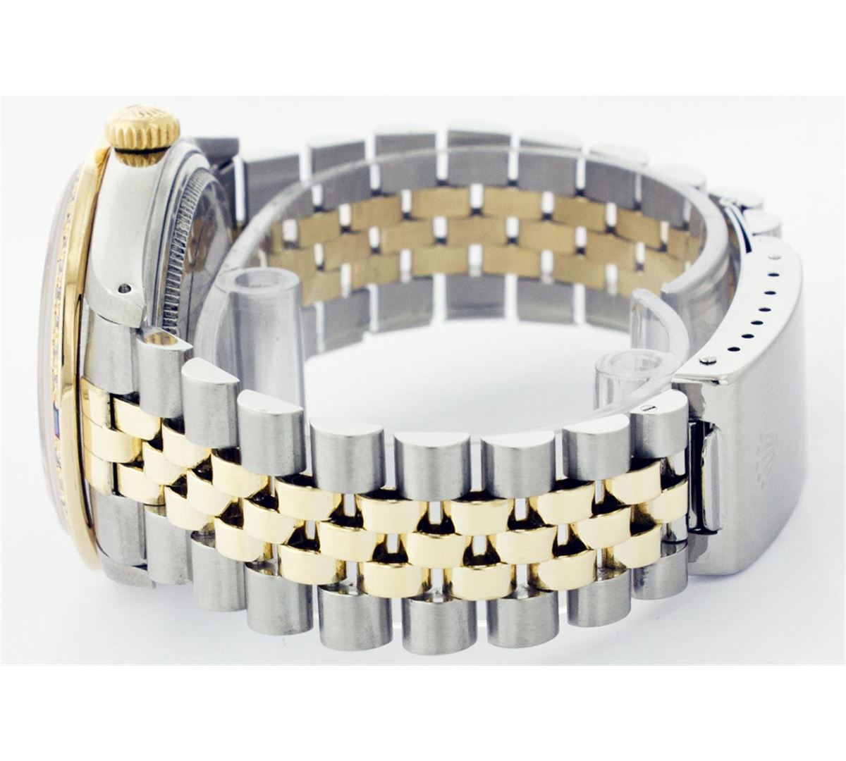One Gents Two Tone Rolex Datejust Polished, Fully Serviced & Electronically Tested, 14K Yellow Gold & Stainless Steel Case:36mm, 14K Yellow Gold Crown, Custom Bezel: 18K Yellow Gold Sapphire Beadset Diamond Bezel, Diamond Count: 36 Diamonds + 4 Sapphires, Total Weight 1.0 Carat, Clarity: Si-VS, Color: G to H. Custom Crystal: Synthetic Sapphire Cyclops Lens. Movement: Automatic Winding Movement Caliber 3035. Custom Dial: Silver Diamond Dial With Square Track and Luminescent Dots. Diamond Count: 10 Diamonds In Dial, Color: G to H, Clarity: SI-VS. Date Window: 3 O'Clock Position Date Display, Quickset, Model: Datejust Condition: G-6 Extra Fine. Bracelet: Two Tone 14K Yellow Gold & Stainless Steel Jubilee. Bright Polish. 6.5 Inch Length, Adjustable. Standard Clasp, With Rolex Logo.