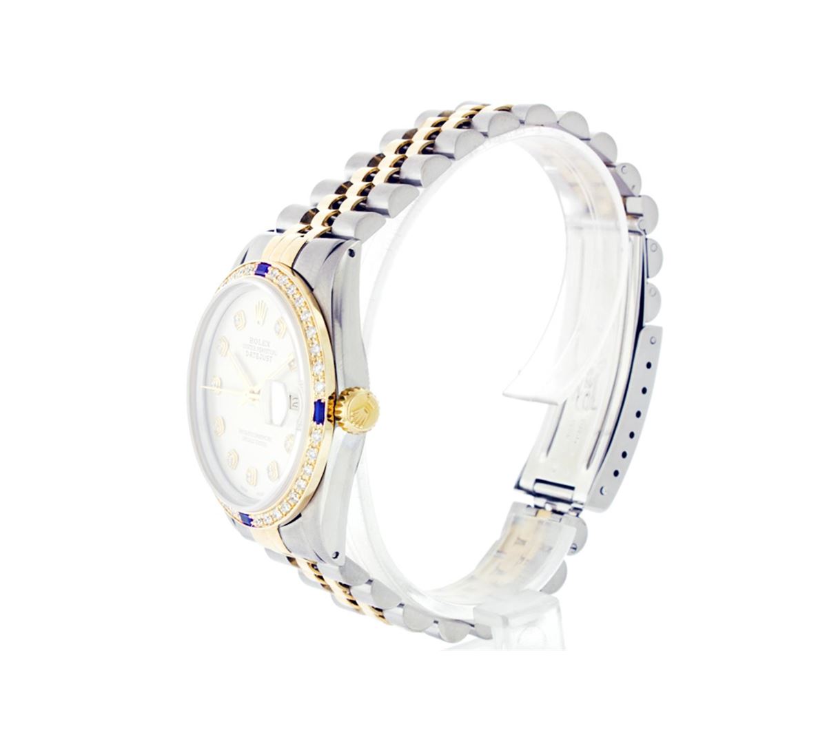 One Gents Two Tone Rolex Datejust Polished, Fully Serviced & Electronically Tested, 14K Yellow Gold & Stainless Steel Case:36mm, 14K Yellow Gold Crown, Custom Bezel: 18K Yellow Gold Sapphire Beadset Diamond Bezel, Diamond Count: 36 Diamonds + 4 Sapphires, Total Weight 1.0 Carat, Clarity: Si-VS, Color: G to H. Custom Crystal: Synthetic Sapphire Cyclops Lens. Movement: Automatic Winding Movement Caliber 3035. Custom Dial: Silver Diamond Dial, Diamond Count: 10 Diamonds In Dial, Color: G to H, Clarity: SI-VS. Date Window: 3 O'Clock Position Date Display, Quickset, Model: Datejust Condition: G-6 Extra Fine. Bracelet: Two Tone 14K Yellow Gold & Stainless Steel Jubilee. Bright Polish. 6.5 Inch Length, Adjustable. Standard Clasp, With Rolex Logo. Comes with a six month warranty card.