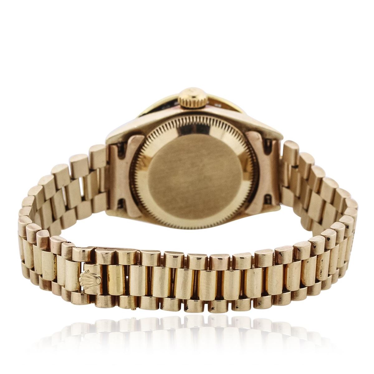 One ladies, hand crafted & machine milled Rolex Oyster Perpetual, model wristwatch electronically tested, Circa: 1986, 14KT yellow gold Case: 25mm oyster, Crown: twinlock with logo, Custom Bezel: diamond set, Custom Crystal: synthetic sapphire lens.Movement: stem wind mechanical, Dial: Light Champagne, with baton hands & indices, Bracelet: 14KT yellow gold jubilee, Condition: G-4 Average. Bright polish & satin finish. Six and one half inch length, adjustable. Concealed 18KT yellow gold deployment clasp, with logo. Containing:Thirty Two single cut diamonds, measuring an average of 2.30mm in diameter, approximate total weight = 1.45ct. Set & graded in the bezel. Clarity VS-2 to SI-2. Color: G - H. Total Weight of Diamonds 1.45ct. Total Weight of Watch 58.93gm. AIG Appraised at $16,300.00.
