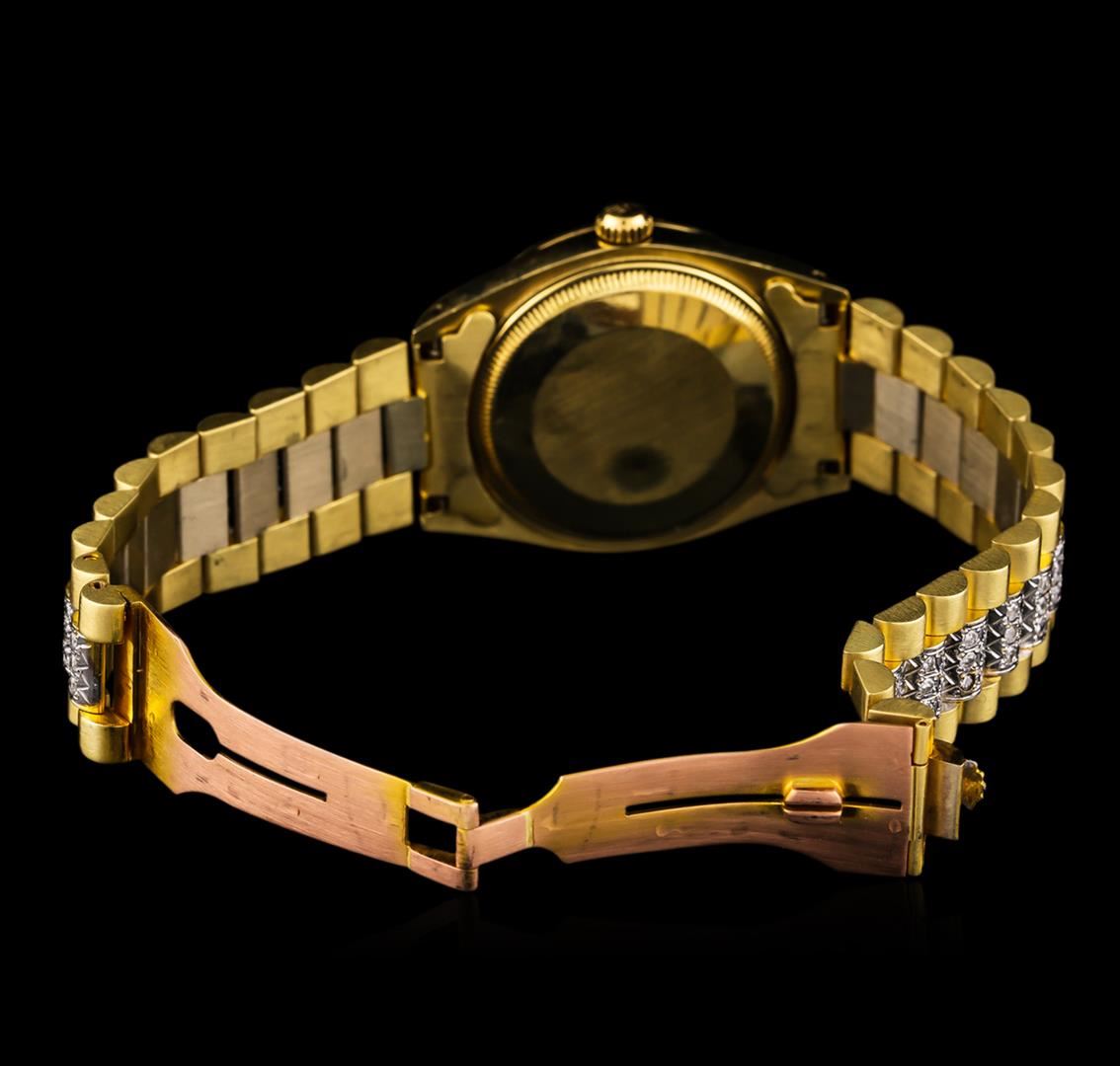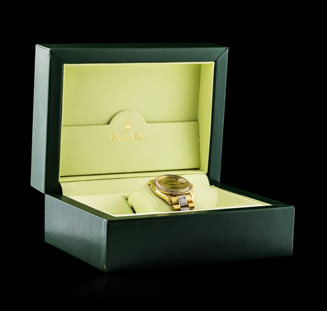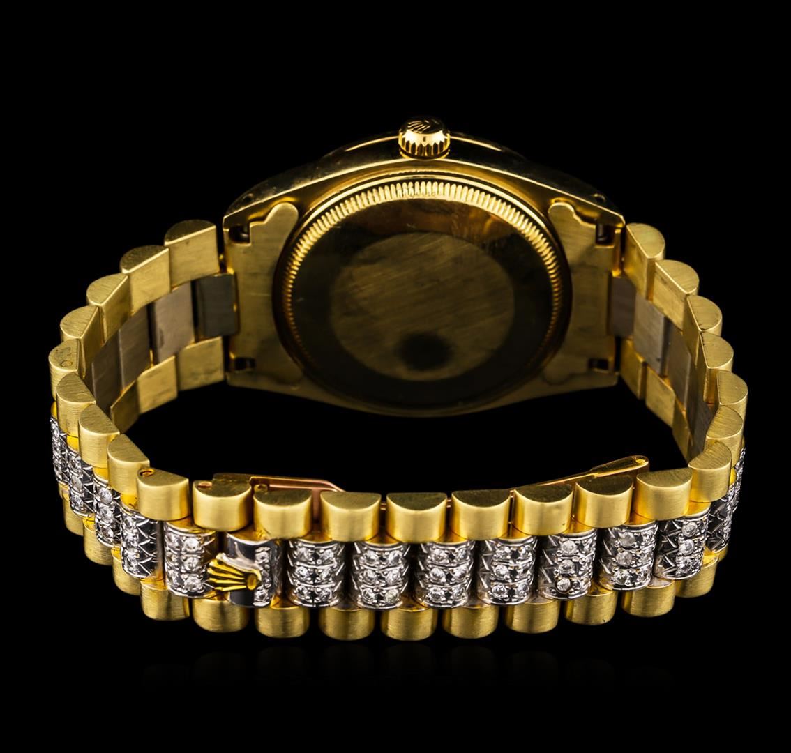 One, hand crafted & machine milled Rolex Date Model wristwatch electronically tested 14KT yellow gold, Case: 35mm oyster, Crown: twin lock with logo, Custom Bezel: diamond set, Crystal: acrylic cyclops lens. Movement: superlative chronometer, Dial: Champagne, with baton hands and diamond markers, Circa: 1979, Calendar: non quickset, Custom Bracelet: 14KT yellow gold President style diamond set, Condition: G-4 Average. Seven and one half inch length, adjustable. Standard clasp, with logo. Containing: Approximately One Hundred Eighty Eight pave and prong set round brilliant cut diamonds, approximate total weight of Stones = 4.00ct. Set & graded in the bezel. Clarity: SI-1 to I-2. Color: G- H. Total Weight of Diamonds 4.00ct. Total Weight of Watch 124.94 grams. AIG Appraised at $23,550.00.