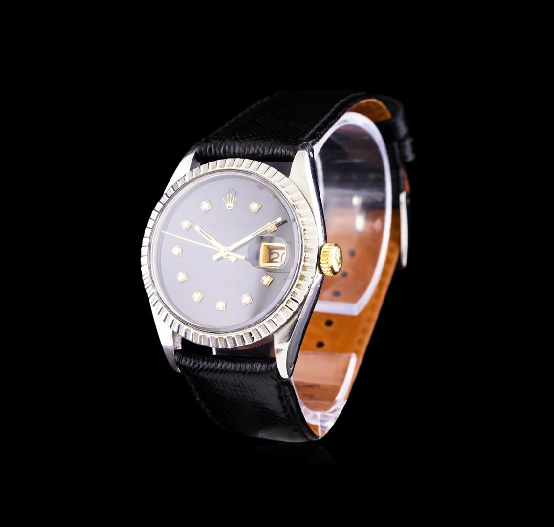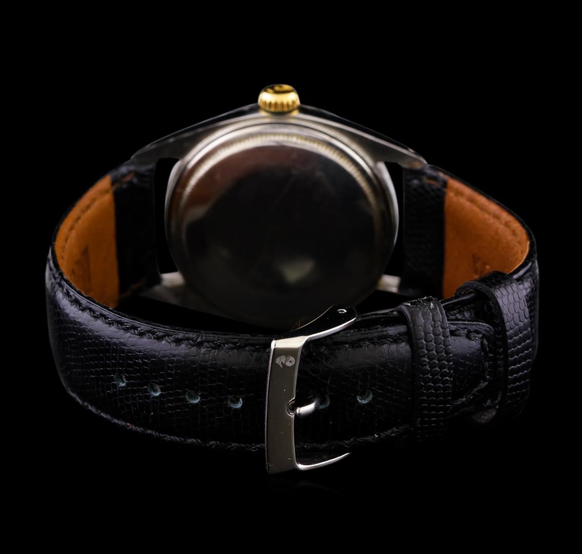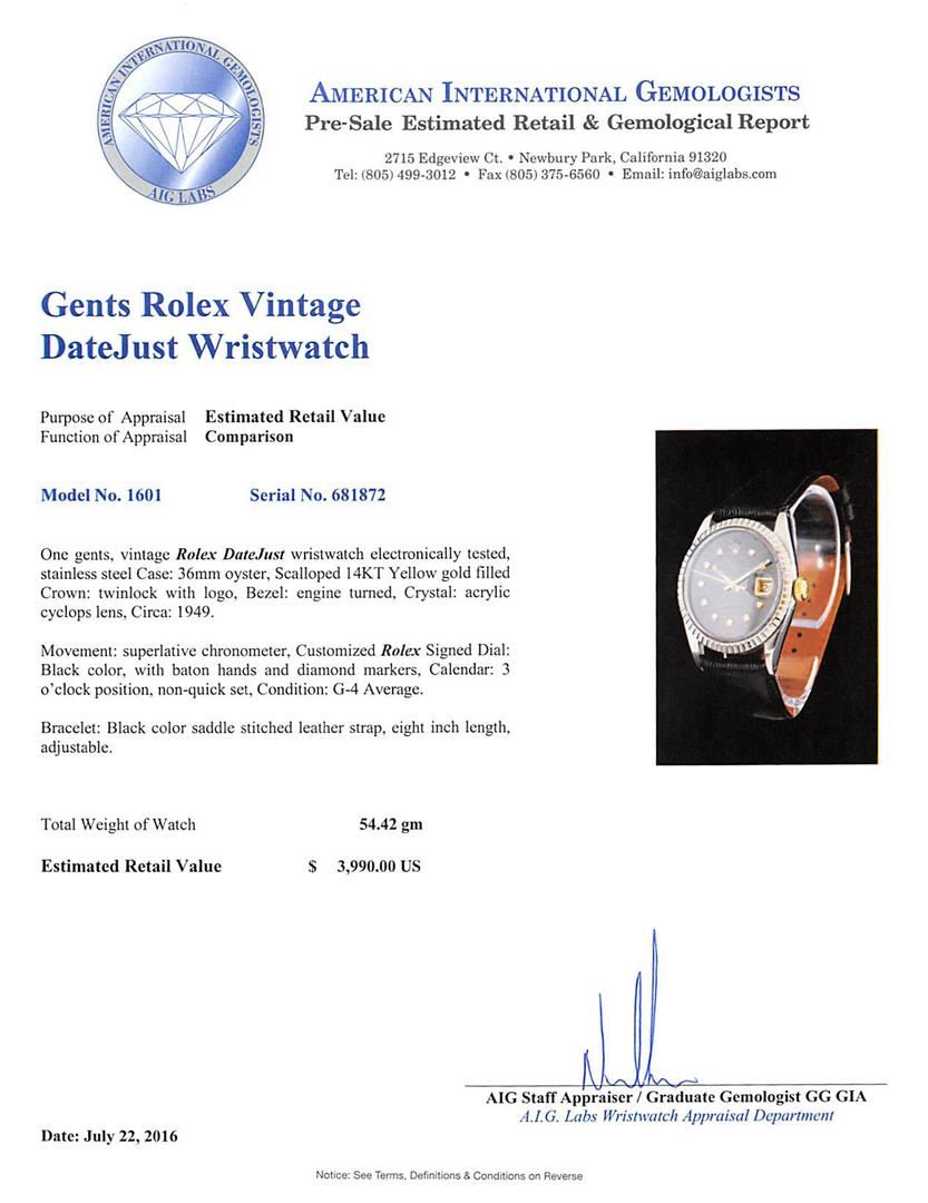 One gents, vintage Rolex DateJust wristwatch electronically tested, stainless steel Case: 36mm oyster, Scalloped 14KT Yellow gold filled Crown: twinlock with logo, Bezel: engine turned, Crystal: acrylic cyclops lens, Circa: 1949.Movement: superlative chronometer, Customized Rolex Signed Dial: Black color, with baton hands and diamond markers, Calendar: 3 o'clock position, non-quick set, Condition: G-4 Average. Bracelet: Black color saddle stitched leather strap, eight inch length, adjustable. Total Weight of Watch 54.42gm. AIG Appraised at $3,990.00.