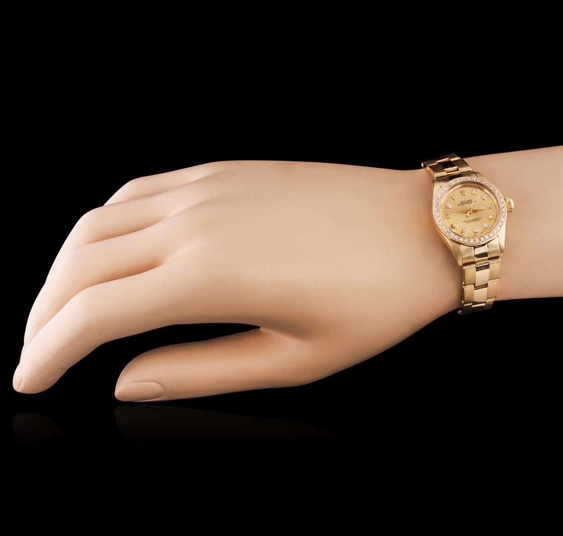 One ladies, hand crafted & machine milled Rolex Oyster Perpetual, model wristwatch electronically tested 14KT yellow gold, Circa: 1979, Case: 25mm oyster, Crown: twinlock with logo, Custom Bezel: diamond set, Crystal: acrylic lens. Movement: superlative chronometer, Custom Dial: dark Champagne color, with baton hands and diamond markers, Bracelet: 14KT yellow gold tapering oyster link, Condition: G-5 Fine. Bright polish & satin finish. Six and three quarter inch length. Standard clasp, with logo. Containing: Forty round brilliant cut diamonds, measuring an average of 1.40mm in diameter, approximate total weight = 0.40ct. Set & graded in the bezel. Clarity: VS-2 to SI-2. Color: G - I. Total Weight of Diamonds 0.40ct. Total Weight of Watch 53.54gm. AIG Appraised at $9,050.00.