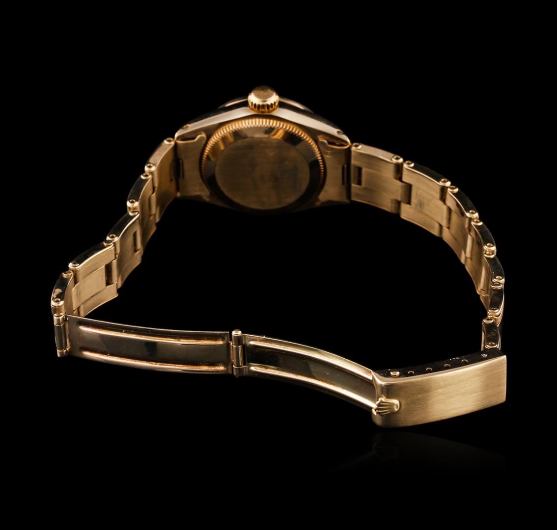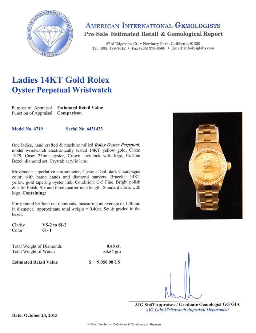 One ladies, hand crafted & machine milled Rolex Oyster Perpetual, model wristwatch electronically tested 14KT yellow gold, Circa: 1979, Case: 25mm oyster, Crown: twinlock with logo, Custom Bezel: diamond set, Crystal: acrylic lens. Movement: superlative chronometer, Custom Dial: dark Champagne color, with baton hands and diamond markers, Bracelet: 14KT yellow gold tapering oyster link, Condition: G-5 Fine. Bright polish & satin finish. Six and three quarter inch length. Standard clasp, with logo. Containing: Forty round brilliant cut diamonds, measuring an average of 1.40mm in diameter, approximate total weight = 0.40ct. Set & graded in the bezel. Clarity: VS-2 to SI-2. Color: G - I. Total Weight of Diamonds 0.40ct. Total Weight of Watch 53.54gm. AIG Appraised at $9,050.00.