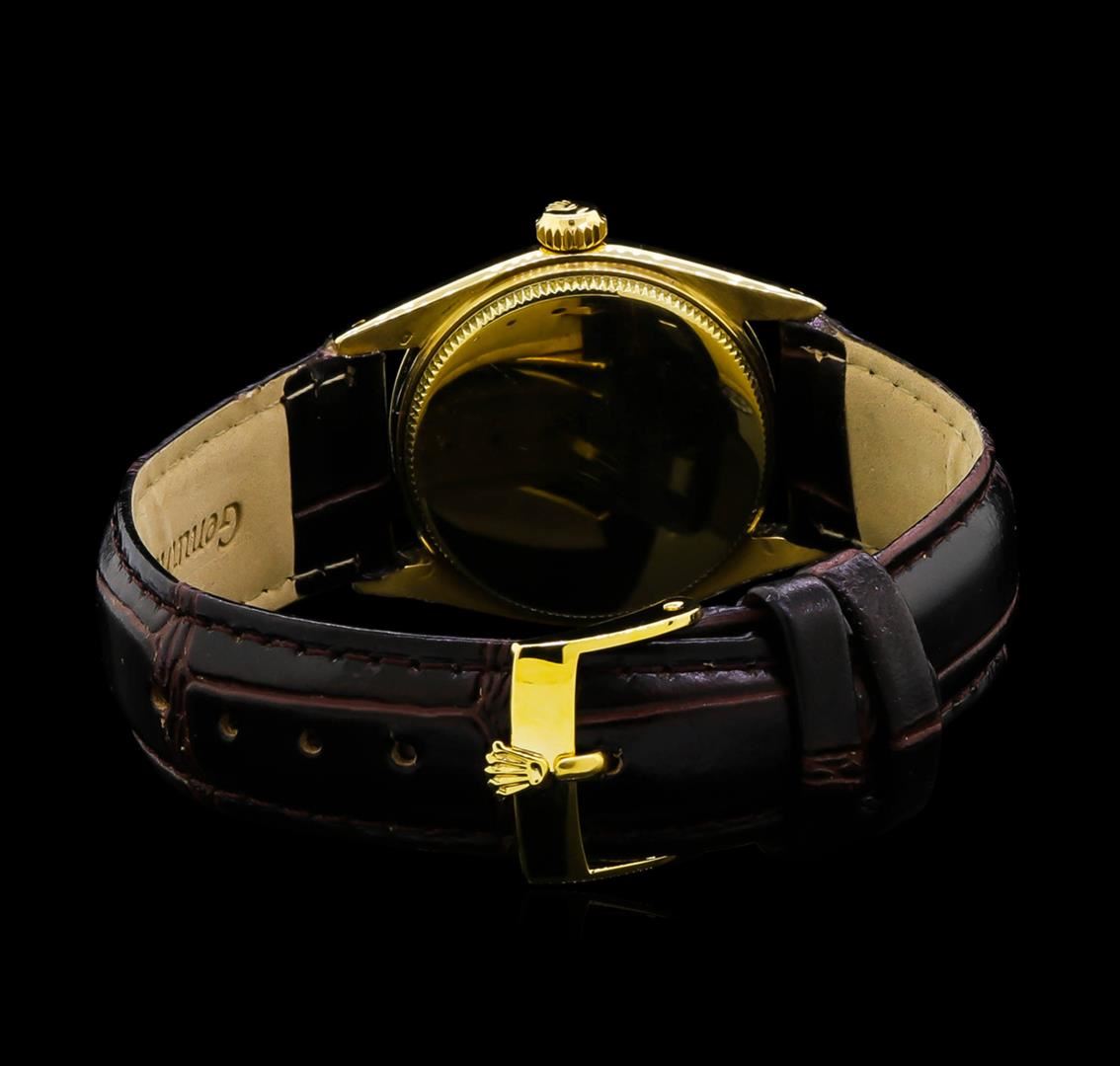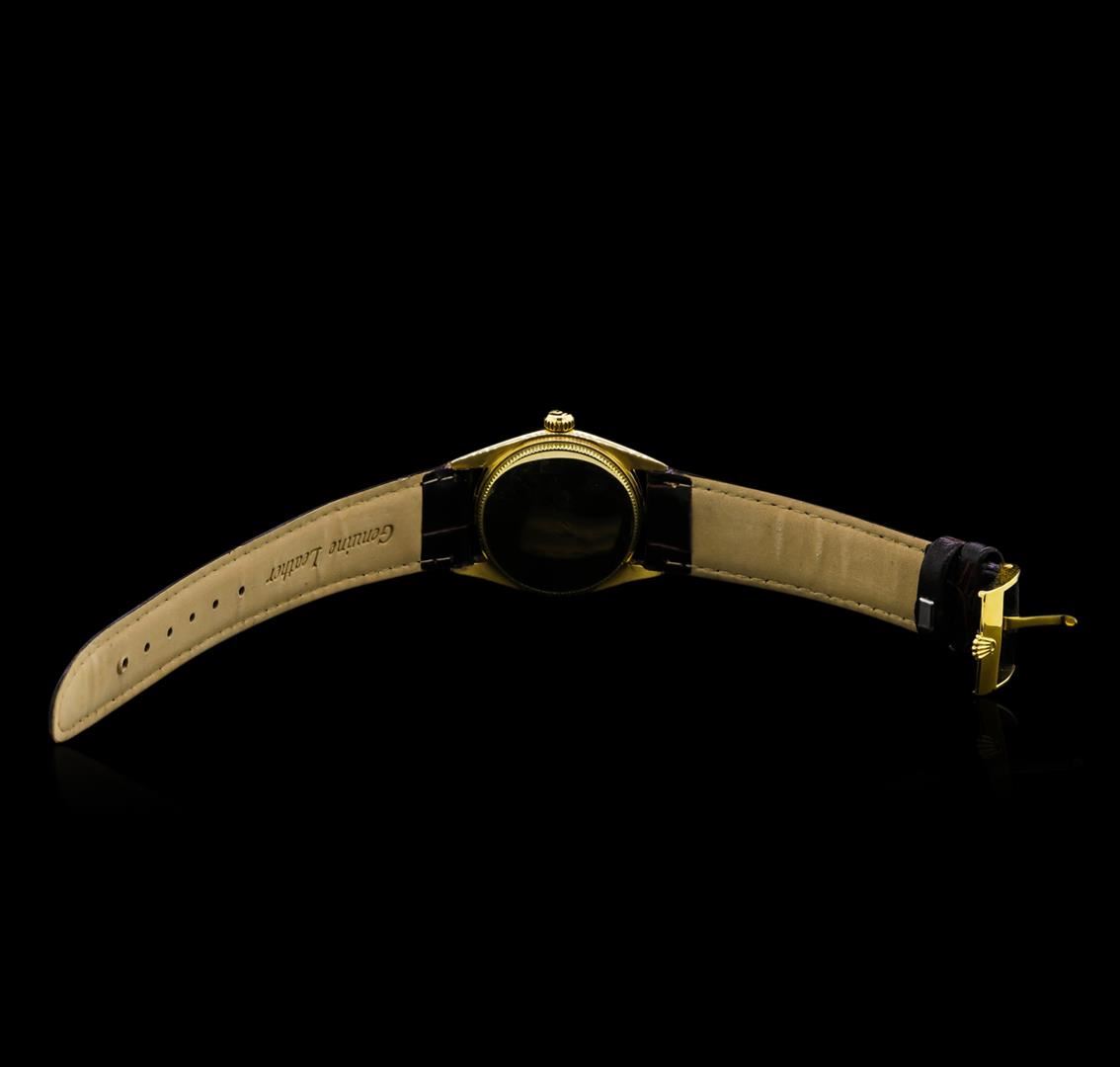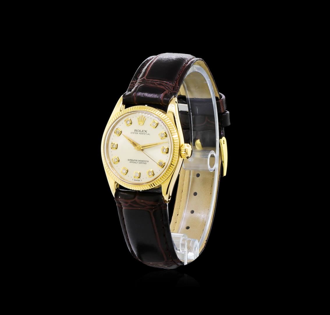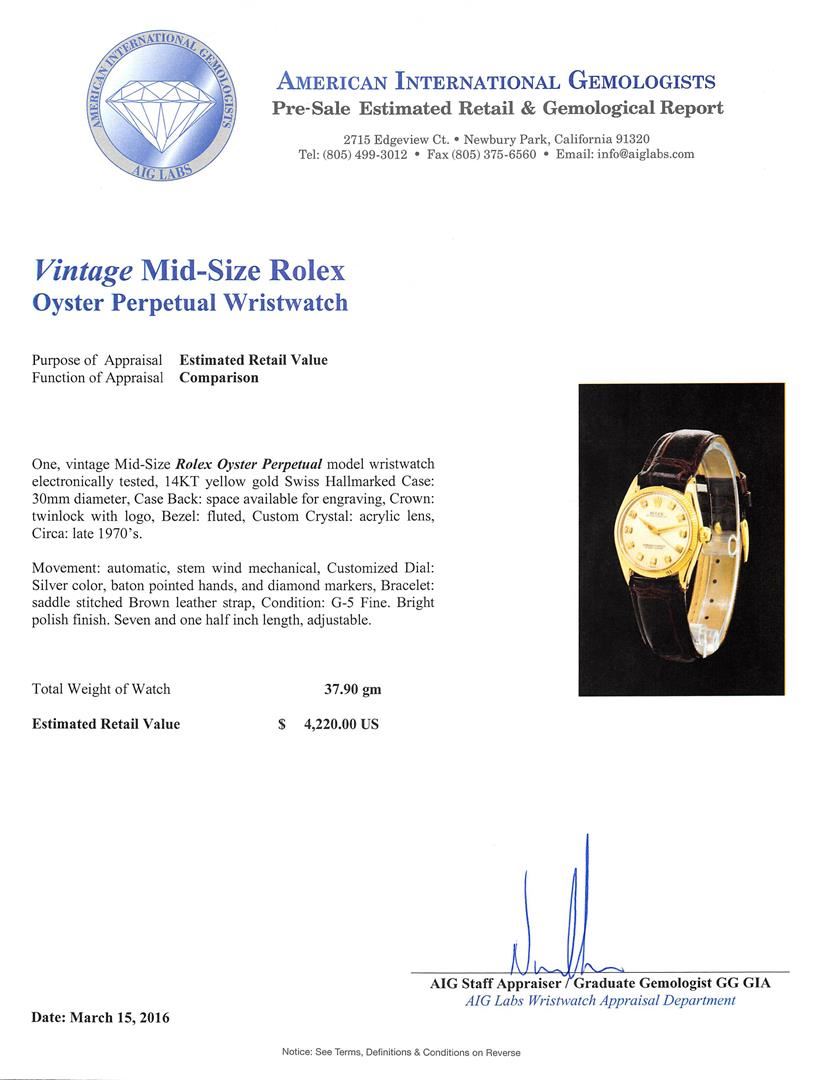 One, vintage Mid-Size Rolex Oyster Perpetual model wristwatch electronically tested, 14KT yellow gold Swiss Hallmarked Case: 30mm diameter, Case Back: space available for engraving, Crown: twinlock with logo, Bezel: fluted, Custom Crystal: acrylic lens, Circa: late 1970's.Movement: automatic, stem wind mechanical, Customized Dial: Silver color, baton pointed hands, and diamond markers, Bracelet: saddle stitched Brown leather strap, Condition: G-5 Fine. Bright polish finish. Seven and one half inch length, adjustable. Total Weight of Watch 37.90gm. AIG Appraised at $4,220.00.
