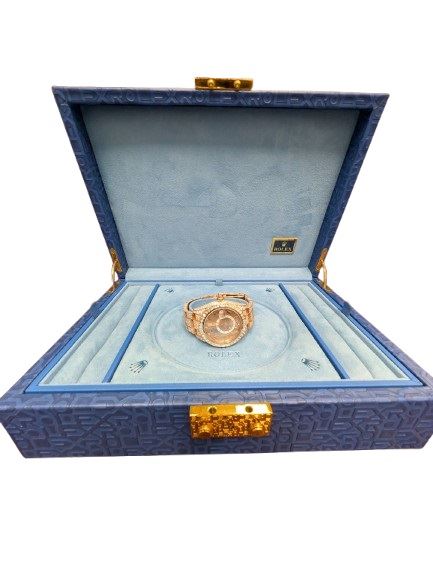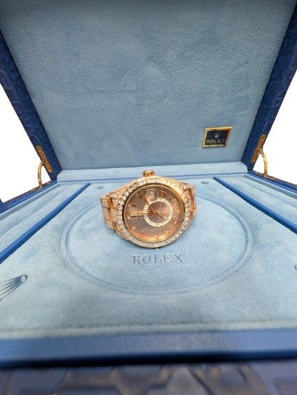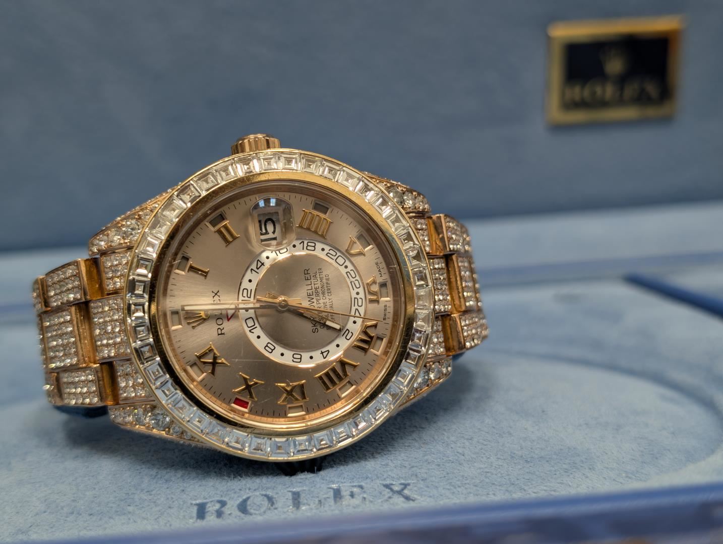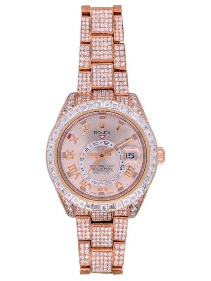 This Rolex Sky-Dweller is crafted from 18K Everose gold and customized with an extravagant 23.80 carats of diamonds. The 42mm case features a custom diamond-encrusted 18K rose gold bezel, framing a rose gold dial with Roman numeral markers. The bracelet is fully set with custom diamonds, complementing the oyster deployment clasp. The timepiece is powered by Rolex's Calibre 9001 movement, ensuring superlative chronometer performance. Diamonds include 42 square-cut channel-set stones totaling 6.00ct, 20 prong-set round brilliant-cut diamonds at 1.20ct, and 2,018 prong-set brilliant-cut diamonds at 16.60ct. A luxury statement with precision engineering