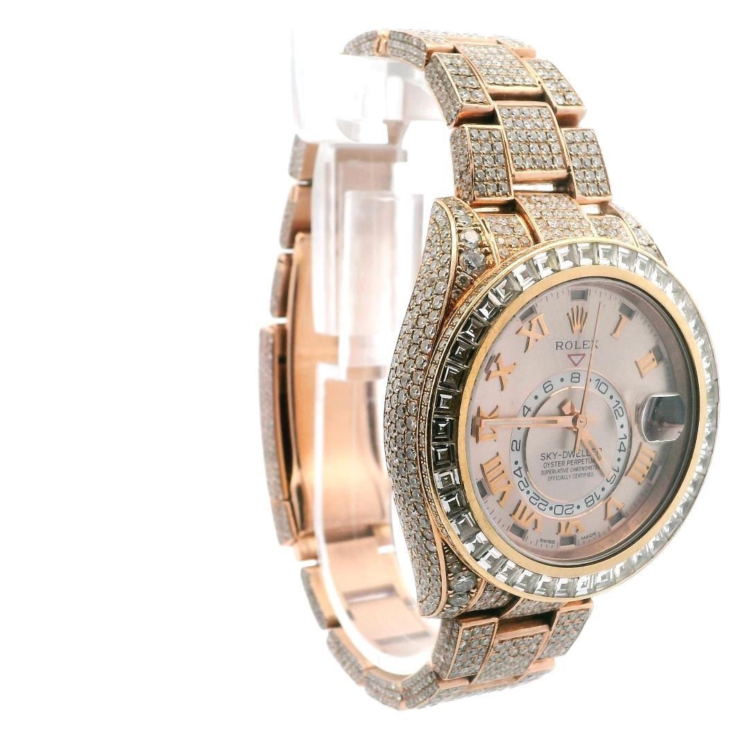 This Rolex Sky-Dweller is crafted from 18K Everose gold and customized with an extravagant 23.80 carats of diamonds. The 42mm case features a custom diamond-encrusted 18K rose gold bezel, framing a rose gold dial with Roman numeral markers. The bracelet is fully set with custom diamonds, complementing the oyster deployment clasp. The timepiece is powered by Rolex's Calibre 9001 movement, ensuring superlative chronometer performance. Diamonds include 42 square-cut channel-set stones totaling 6.00ct, 20 prong-set round brilliant-cut diamonds at 1.20ct, and 2,018 prong-set brilliant-cut diamonds at 16.60ct. A luxury statement with precision engineering