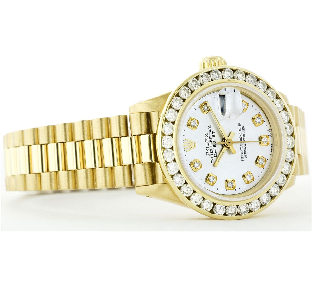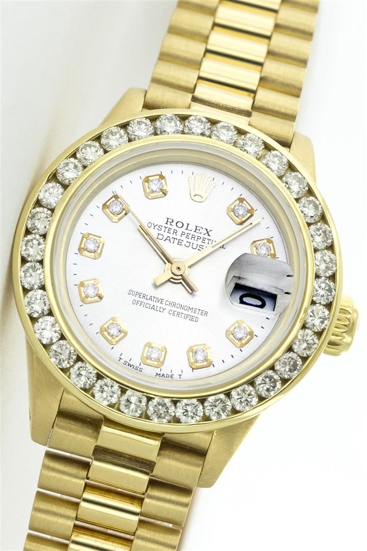 One Ladies 18K Rolex President Polished, Serviced & Electronically Tested, 18K Yellow Gold Case: 26mm, Yellow Gold Crown, Bezel: 18K Yellow Gold 2ctw Channel Set Diamond Bezel, Diamond Count: 32 Diamonds Total Weight 2.00 Carat, Clarity: SI-VS, Color: G to H. Custom Crystal: Sapphire Crystal, Cyclops Lens. Movement: Automatic Winding Movement Caliber 2030. Custom Dial: Mother Of Pearl Diamond Dial, Diamond Count: 10 Diamonds In Dial, Clarity: SI-VS, Color: G to H. Date Window: 3 O'Clock Position, Model: Datejust, Condition: G-6 Extra Fine. Bracelet: 18K Yellow Gold President With Hidden Clasp, Bright & Satin Polish. 5.5 Inch Length, Standard President Clasp (Hidden Clasp), With Rolex Logo.