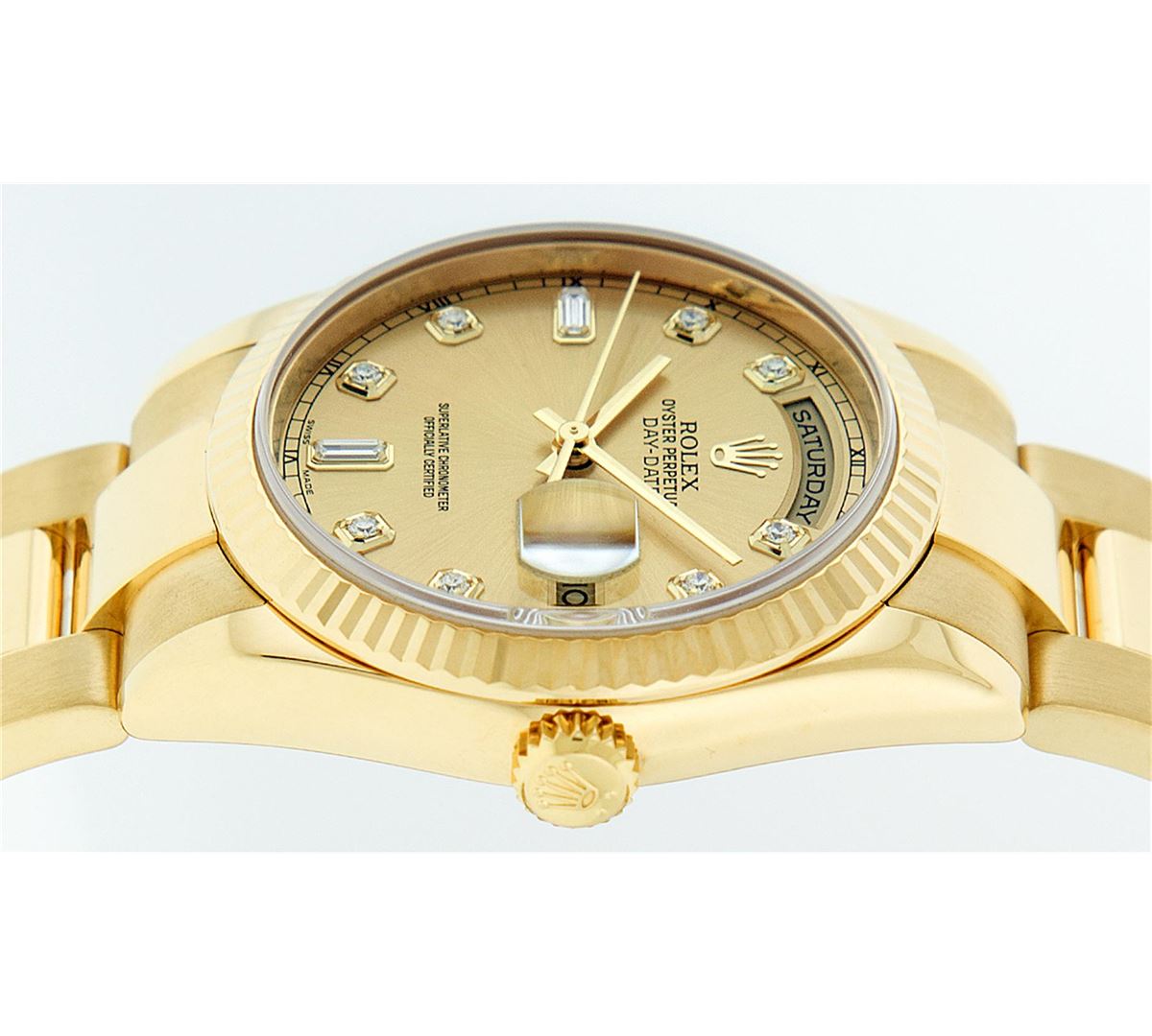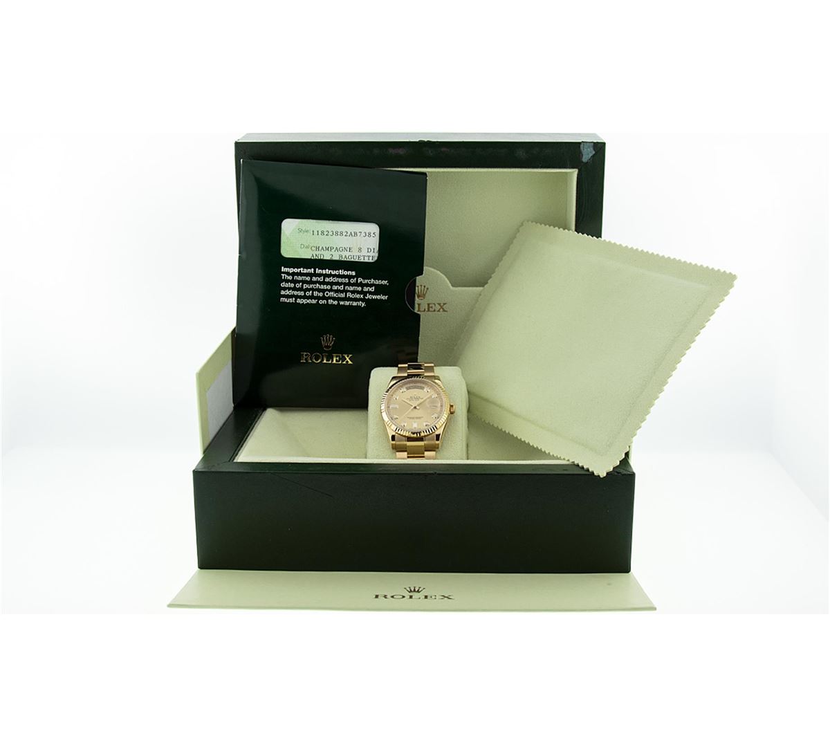 One Mens 18K Yellow Gold Rolex Day Date President Polished, Serviced & Electronically Tested, 18K Yellow Gold Case:36mm, Bezel: 18K Yellow Gold Fluted Bezel. Crystal: Synthetic Sapphire Cyclops Lens. Movement: Automatic Winding Movement Caliber 3155. Dial: Champagne Diamond & Baguette Dial, (8 Diamond + 2 Baguette Diamonds In Dial) E In Color, Clarity: VS. Date Window: 3 O'Clock Position Date Display, Day Display: 12 O'Clock Position. Double Quickset, Model: 118238. Condition: G-6 Extra Fine. Bracelet: Yellow Gold Oyster Band President Band. Bright Polish. 7.0 Inch Length, Standard Oyster Band President Clasp, With Rolex Logo. Comes With Box & Papers. Comes with 6 month warranty.