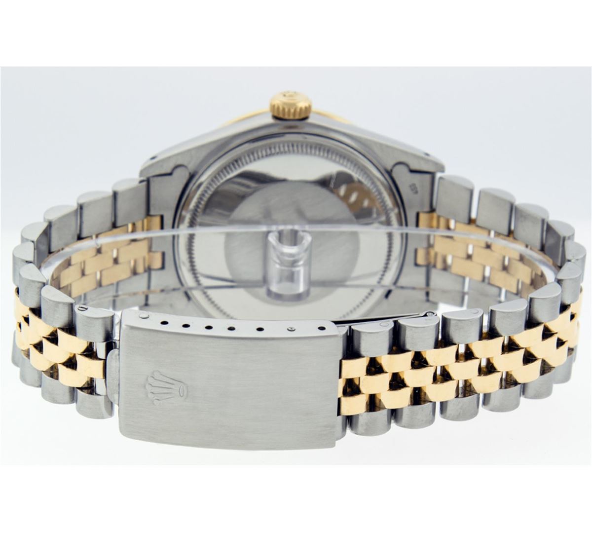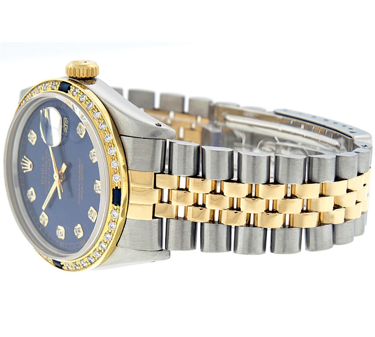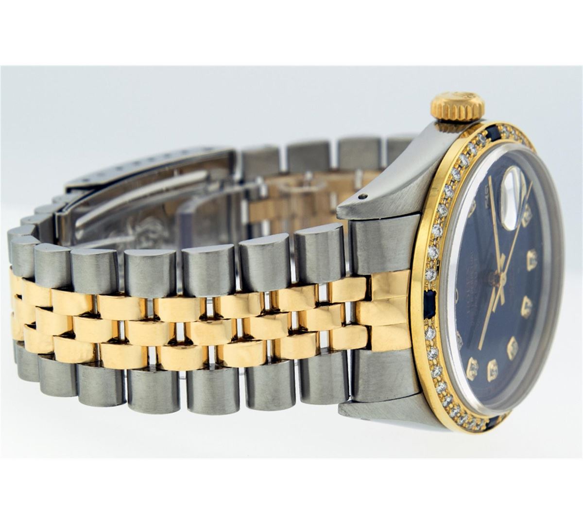 One Gents Two Tone Rolex Datejust Polished, Serviced & Electronically Tested, 18K Yellow Gold & Stainless Steel Case:36mm, 18K Yellow Gold Crown, Custom Bezel: 18K Yellow Gold Sapphire Beadset Diamond Bezel, Diamond Count: 36 Diamonds + 4 Sapphires Total Weight 1.00 Carat, Clarity: Si-VS, Color: G to H. Custom Crystal: Synthetic Sapphire Cyclops Lens. Movement: Automatic Winding Movement Caliber 3135. Custom Dial: Blue Dial Set With Diamond Hour Markers & Square Roman Track, Diamond Count: 10 Diamonds in Dial G To H In Color, Si-VS Clarity, Date Window: 3 O'clock Position Date Display, Quickset, Model: 16233 Condition: G-6 Extra Fine. Bracelet: Two Tone 18K Yellow Gold & Stainless Steel Jubilee. Bright Polish. 6.5 Inch Length, Adjustable. Standard Clasp, With Rolex Logo.