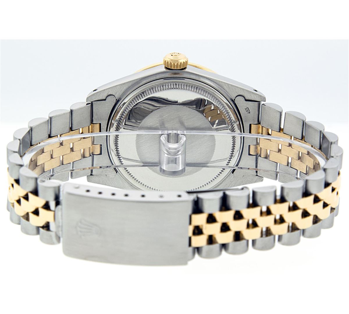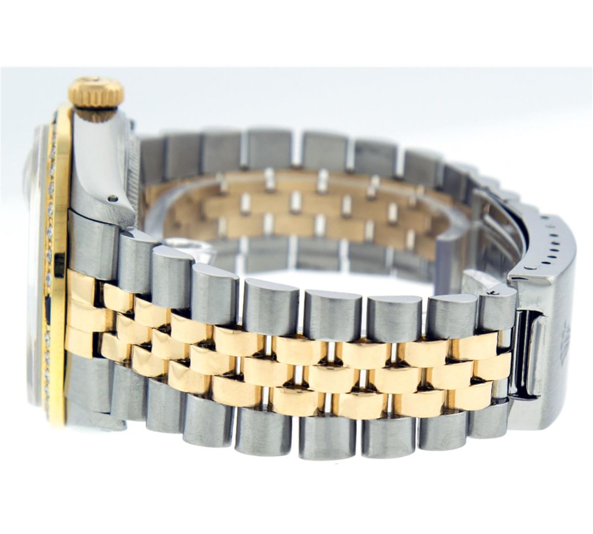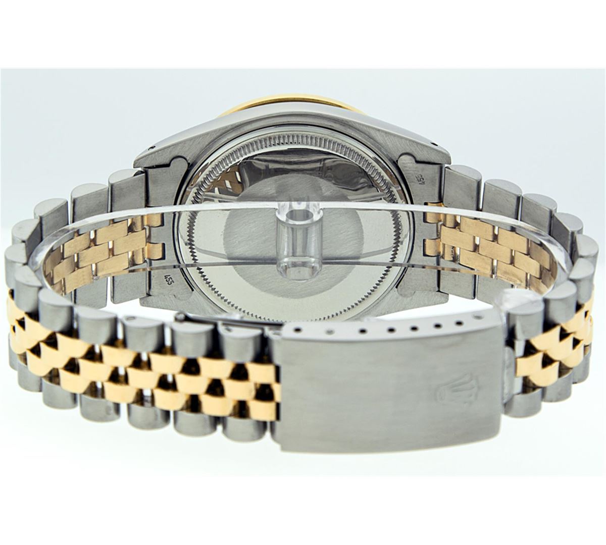 One Gents Two Tone Rolex Datejust Polished, Serviced & Electronically Tested, 18K Yellow Gold & Stainless Steel Case:36mm, 18K Yellow Gold Crown, Custom Bezel: 18K Yellow Gold Sapphire Beadset Diamond Bezel, Diamond Count: 36 Diamonds + 4 Sapphires Total Weight 1.00 Carat, Clarity: Si-VS, Color: G to H. Custom Crystal: Synthetic Sapphire Cyclops Lens. Movement: Automatic Winding Movement Caliber 3135. Custom Dial: Blue Dial Set With Diamond Hour Markers & Square Roman Track, Diamond Count: 10 Diamonds in Dial G To H In Color, Si-VS Clarity, Date Window: 3 O'clock Position Date Display, Quickset, Model: 16233 Condition: G-6 Extra Fine. Bracelet: Two Tone 18K Yellow Gold & Stainless Steel Jubilee. Bright Polish. 6.5 Inch Length, Adjustable. Standard Clasp, With Rolex Logo.