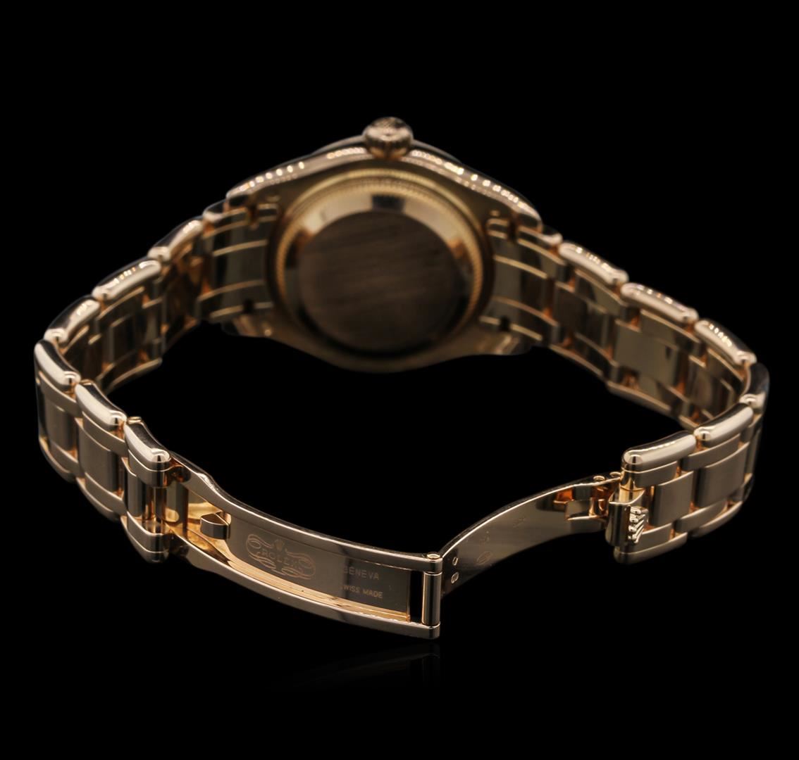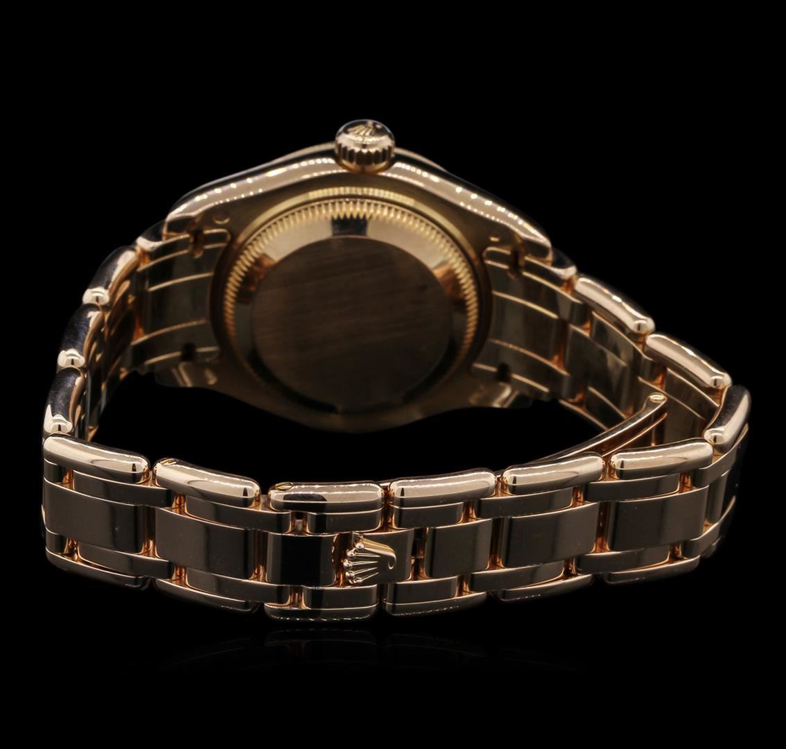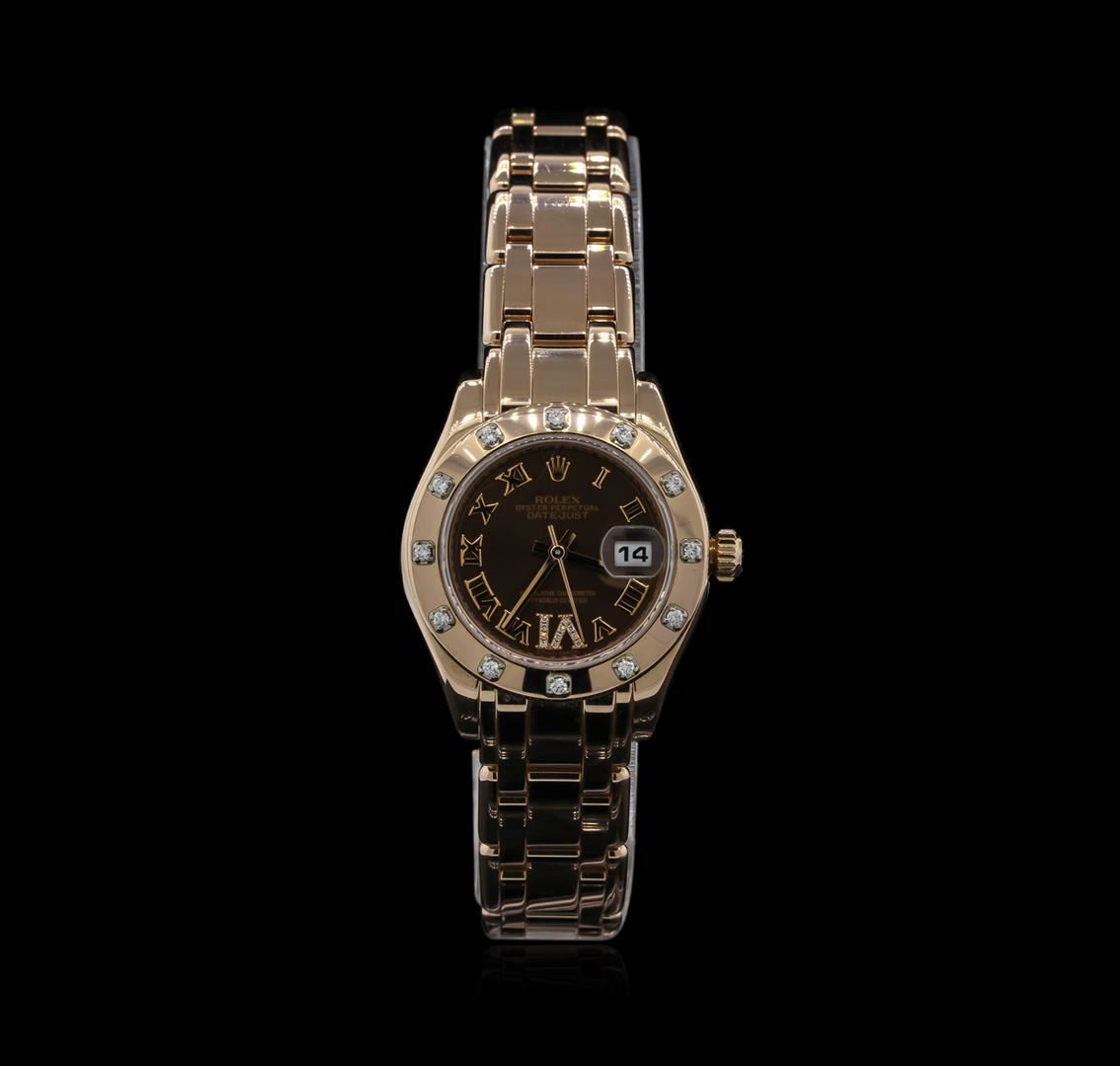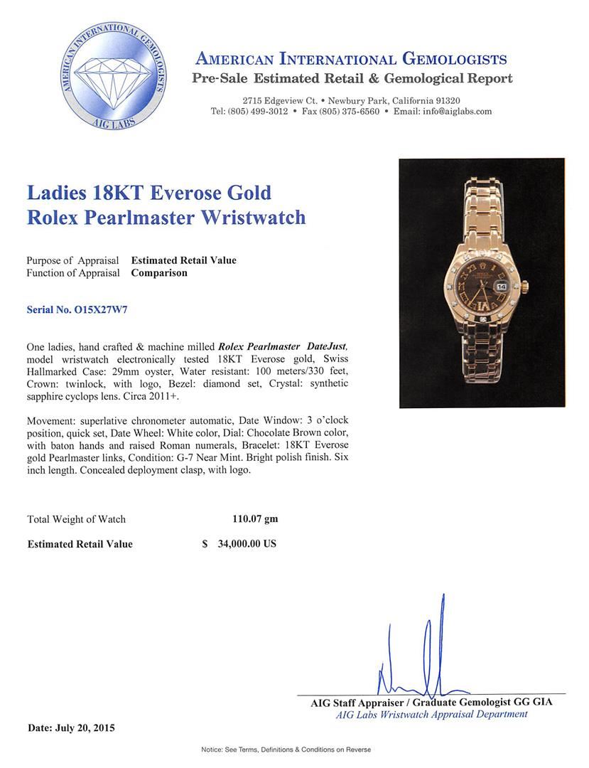 One ladies, hand crafted & machine milled Rolex Pearlmaster DateJust, model wristwatch electronically tested 18KT Everose gold, Swiss Hallmarked Case: 29mm oyster, Water resistant: 100 meters/330 feet, Crown: twinlock, with logo, Bezel: diamond set, Crystal: synthetic sapphire cyclops lens. Circa 2011+.Movement: superlative chronometer automatic, Date Window: 3 o'clock position, quick set, Date Wheel: White color, Dial: Chocolate Brown color, with baton hands and raised Roman numerals, Bracelet: 18KT Everose gold Pearlmaster links, Condition: G-7 Near Mint. Bright polish finish. Six inch length. Concealed deployment clasp, with logo. Total Weight of Watch 110.07gm. AIG Appraised at $34,000.00.
