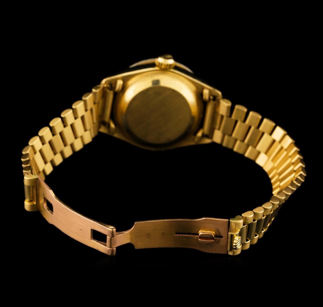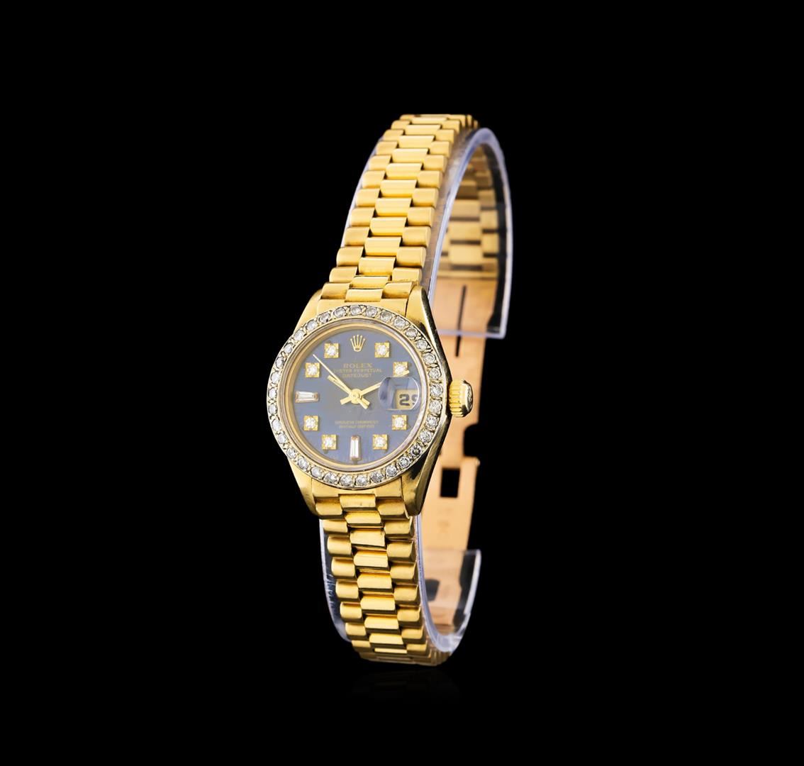 One Rolex DateJust ladies watch featuring: Case: 18KT yellow gold. Bezel: Diamond set yellow gold. Crystal: Scratch-resistant sapphire. Dial: Deep blue color; diamond hour markers. Features: Date window located at the 3 o'clock position. Bracelet: 18KT yellow gold with hidden clasp. Condition: Barely noticeable surface scratches on case, but otherwise there are no major signs of wear.