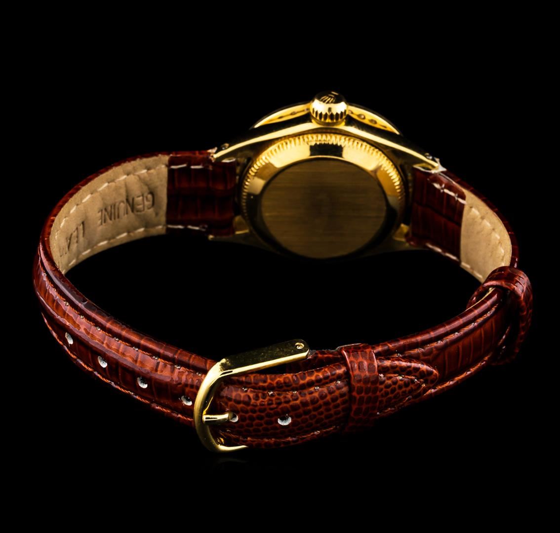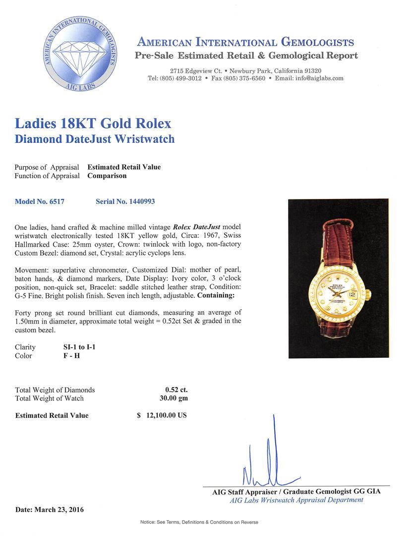 One ladies, hand crafted & machine milled vintage Rolex DateJust model wristwatch electronically tested 18KT yellow gold, Circa: 1967, Swiss Hallmarked Case: 25mm oyster, Crown: twinlock with logo, non-factory Custom Bezel: diamond set, Crystal: acrylic cyclops lens. Movement: superlative chronometer, Customized Dial: mother of pearl, baton hands, & diamond markers, Date Display: Ivory color, 3 o'clock position, non-quick set, Bracelet: saddle stitched leather strap, Condition: G-5 Fine. Bright polish finish. Seven inch length, adjustable. Containing: Forty prong set round brilliant cut diamonds, measuring an average of 1.50mm in diameter, approximate total weight = 0.52ct Set & graded in the custom bezel. Clarity SI-1 to I-1. Color: F - H. Total Weight of Diamonds 0.52ct. Total Weight of Watch 30.00gm. AIG Appraised at $12,100.00.