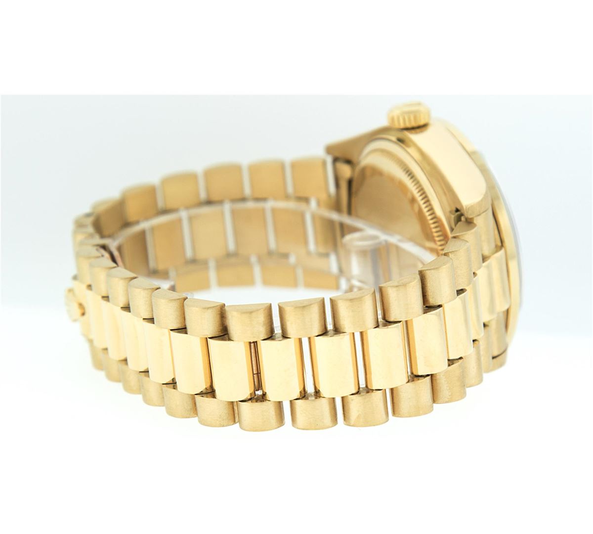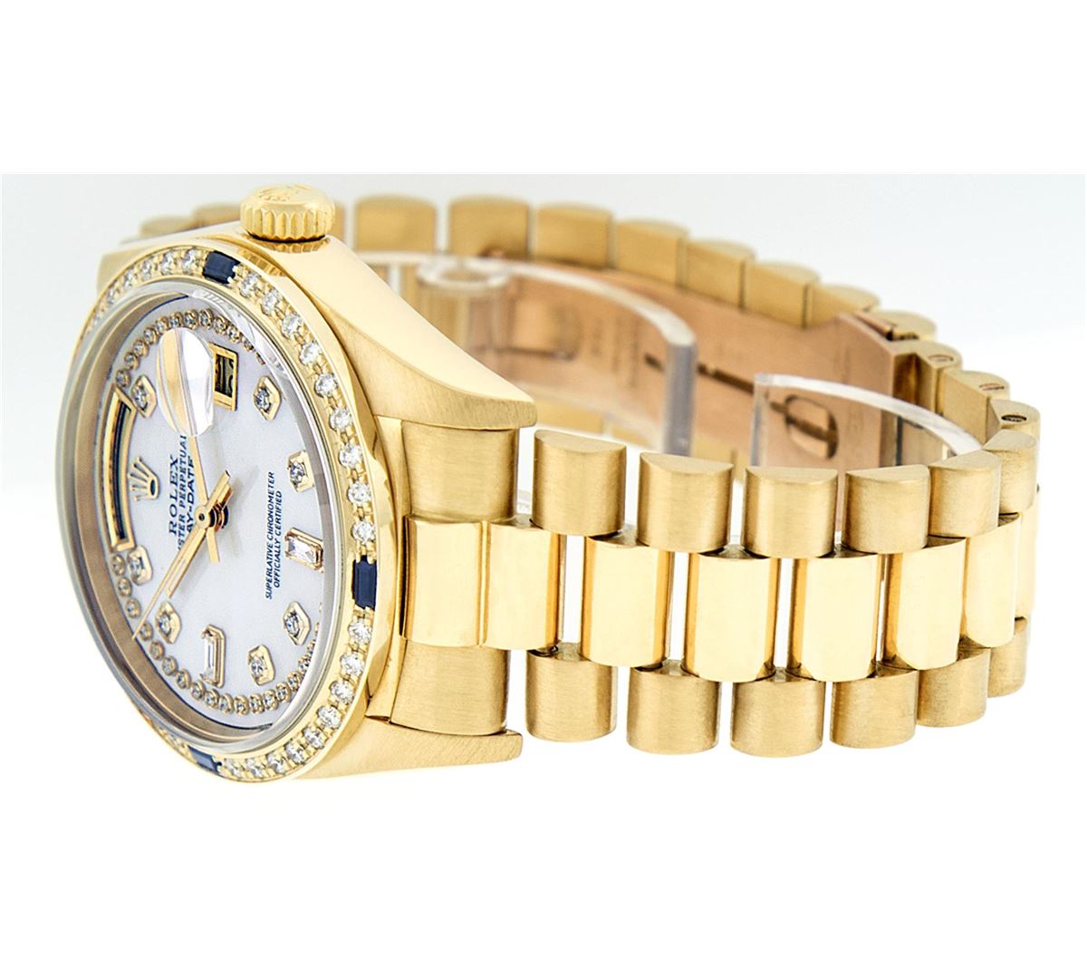 One Mens Rolex Day Date 18K Yellow Gold President Polished, Serviced & Electronically Tested, 18K Yellow Gold Case:36mm, 18K Yellow Gold Crown, Custom Bezel: 18K Yellow Gold Sapphire Beadset Diamond Bezel, Diamond + Gem Count: 36 Diamonds + 4 Sapphires, Total Weight 1.00 Carat, Clarity: SI-VS, Color: G to H. Custom Crystal: Synthetic Sapphire Cyclops Lens. Movement: Automatic Winding Movement Caliber 3055. Custom Dial: Mother Of Pearl String Diamond Dial With 2 Baguettes, (49 Diamond In Dial + 2 Baguette Diamonds In Dial) G To H In Color, Clarity: SI-VS. Date Window: 3 O'Clock Position Date Display, Day Window: 12 O'Clock Position Date Display. Single Quickset, Model: Day Date President. Condition: G-6 Extra Fine. Bracelet: 18K Yellow Gold President. Bright Polish. 7.0 Inch Length, Standard Hidden President Clasp President Band, With Rolex Logo.