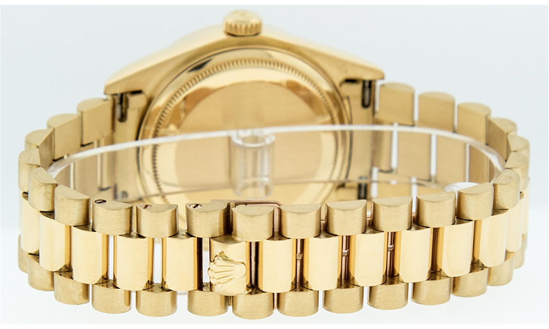 One Mens Rolex Day Date 18K Yellow Gold President Polished, Serviced & Electronically Tested, 18K Yellow Gold Case:36mm, 18K Yellow Gold Crown, Custom Bezel: 18K Yellow Gold Sapphire Beadset Diamond Bezel, Diamond + Gem Count: 36 Diamonds + 4 Sapphires, Total Weight 1.00 Carat, Clarity: SI-VS, Color: G to H. Custom Crystal: Synthetic Sapphire Cyclops Lens. Movement: Automatic Winding Movement Caliber 3055. Custom Dial: Mother Of Pearl String Diamond Dial With 2 Baguettes, (49 Diamond In Dial + 2 Baguette Diamonds In Dial) G To H In Color, Clarity: SI-VS. Date Window: 3 O'Clock Position Date Display, Day Window: 12 O'Clock Position Date Display. Single Quickset, Model: Day Date President. Condition: G-6 Extra Fine. Bracelet: 18K Yellow Gold President. Bright Polish. 7.0 Inch Length, Standard Hidden President Clasp President Band, With Rolex Logo.